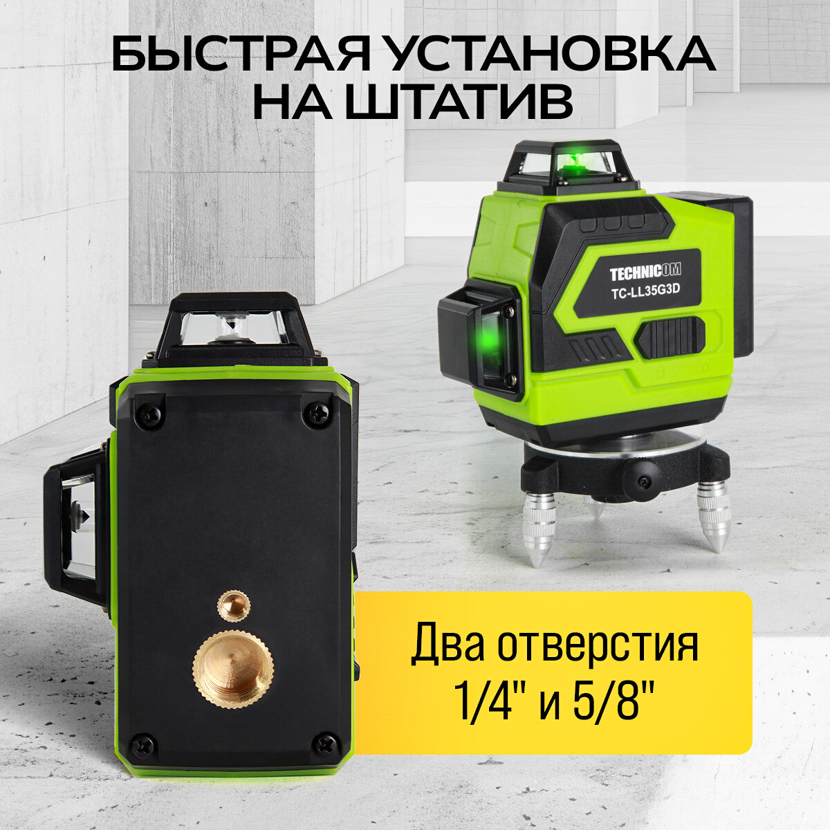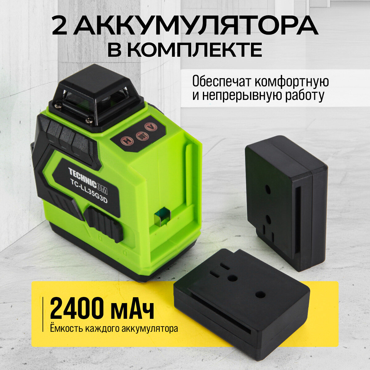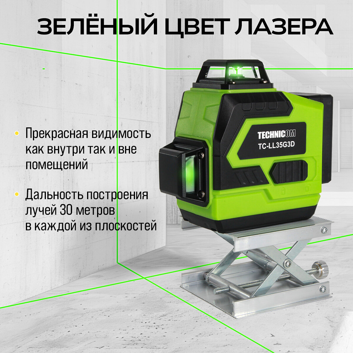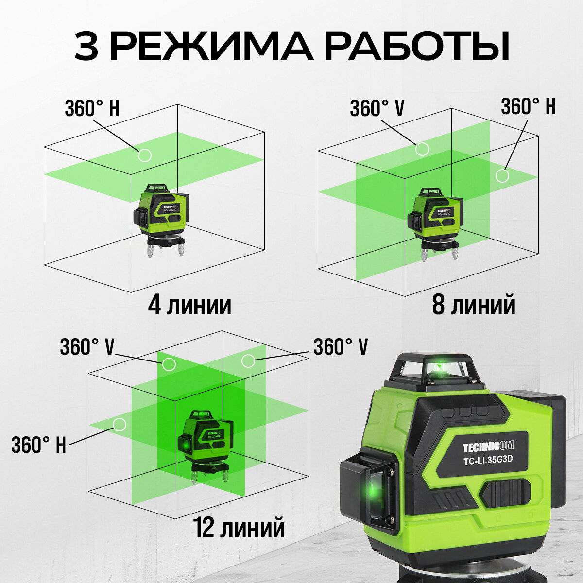 Лазерный 3D уровень TECHNICOM TC-LL35G3D, 12 лучей, дистанция 30м, 3 режима, 2 акб 2400мАч, цвет лазера зелёный интересное: