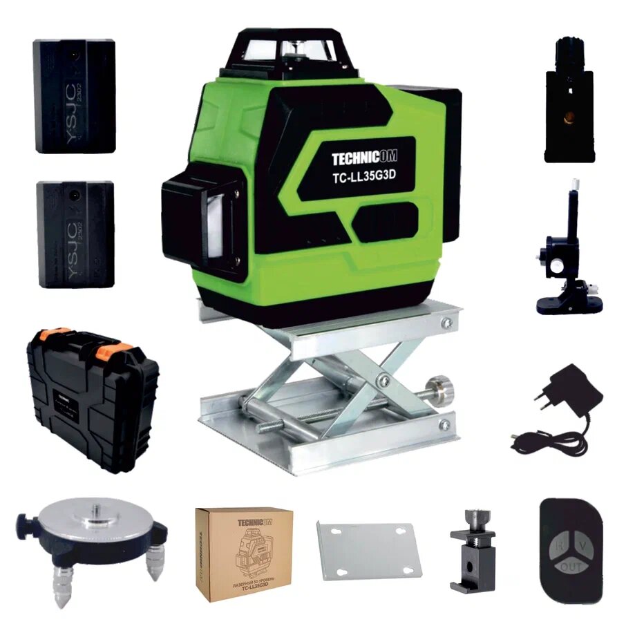 Купить Лазерный 3D уровень TECHNICOM TC-LL35G3D, 12 лучей, дистанция 30м, 3 режима, 2 акб 2400мАч, цвет лазера зелёный