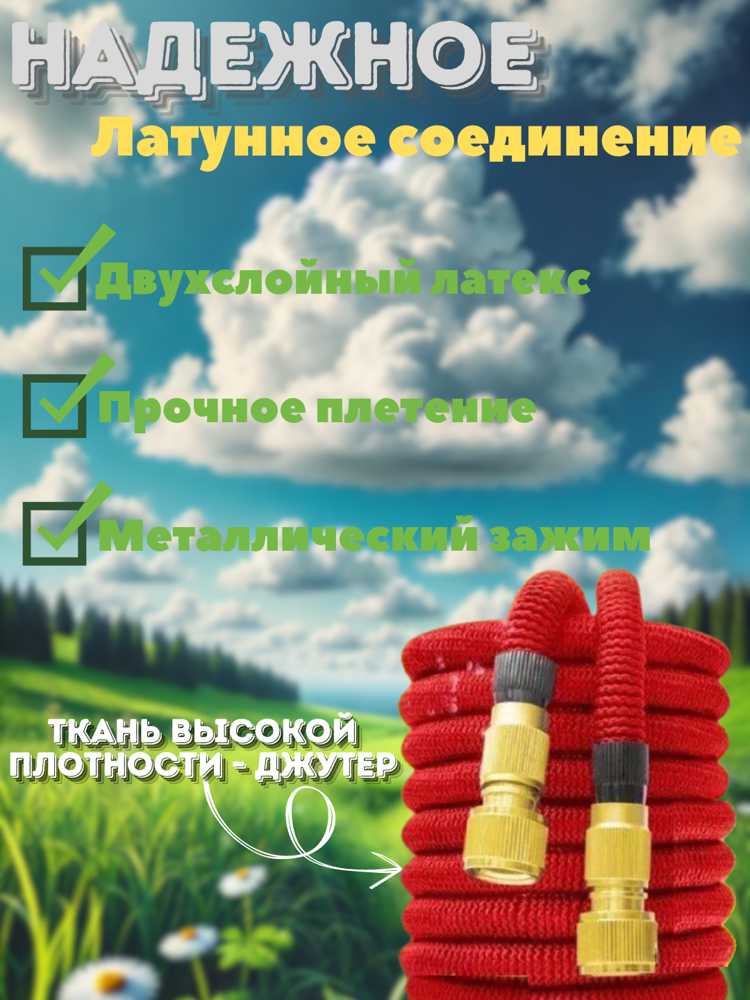 Шланг садовый растягивающийся 50 метров для полива с распылителем с быстросъемом/ 50 метров красный с металлическим соединением, быстросъём