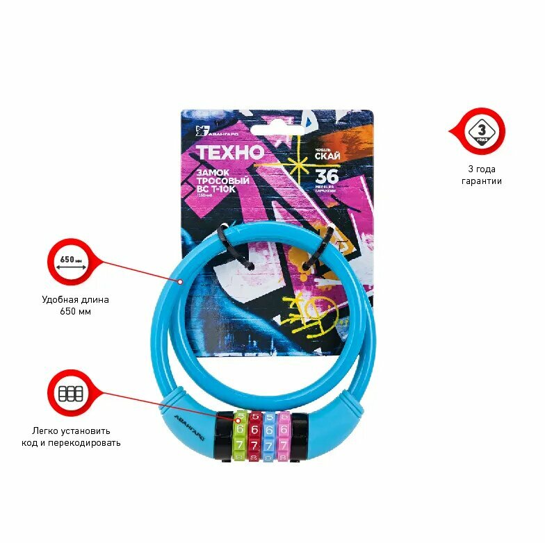 Замок велосипедный тросовый Авангард ВС-Т10К (650 мм) техно скай