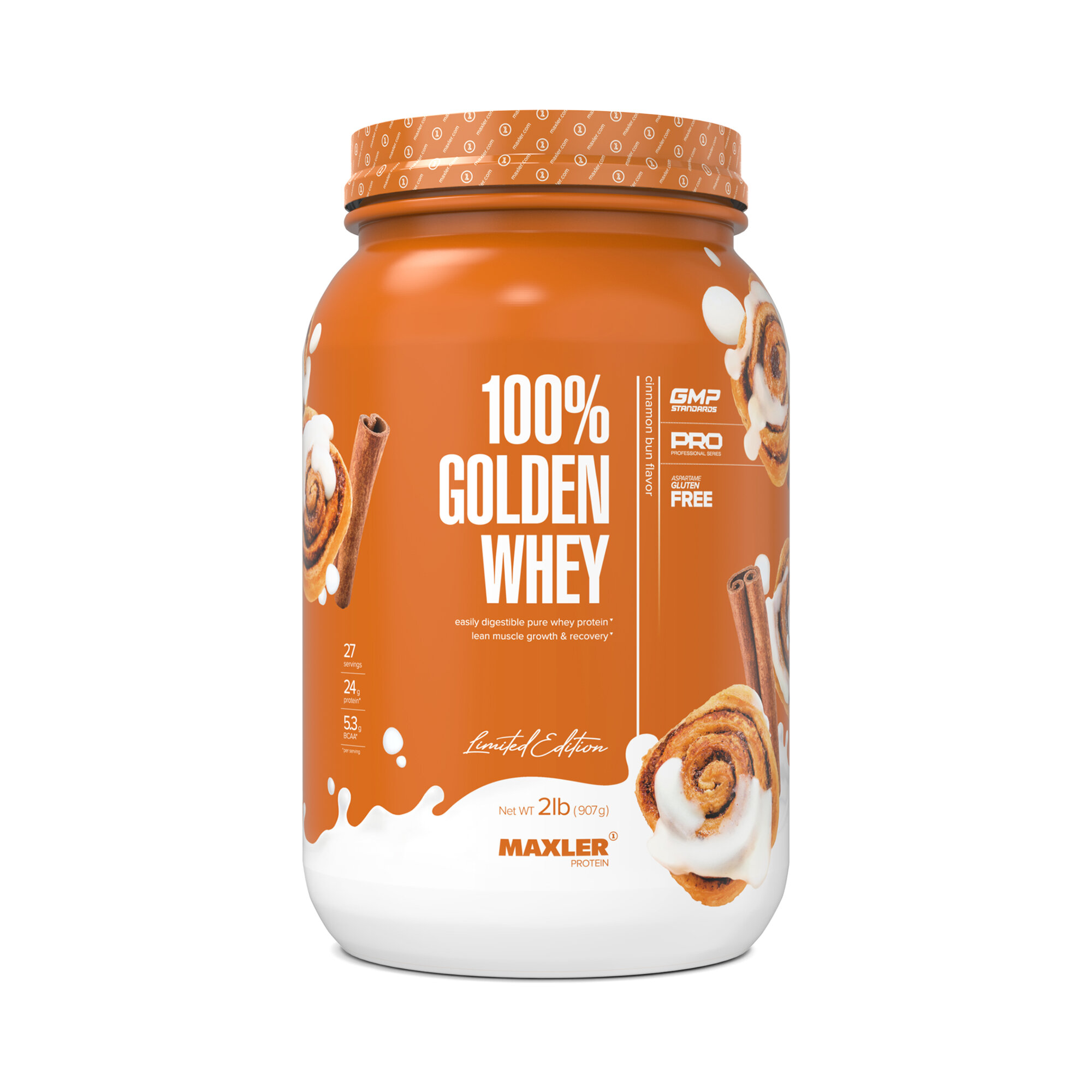 Купить Чистый сывороточный белок премиум класса 100% Golden Whey Protein 908 гр 2 lb (Maxler) Булочка с корицей