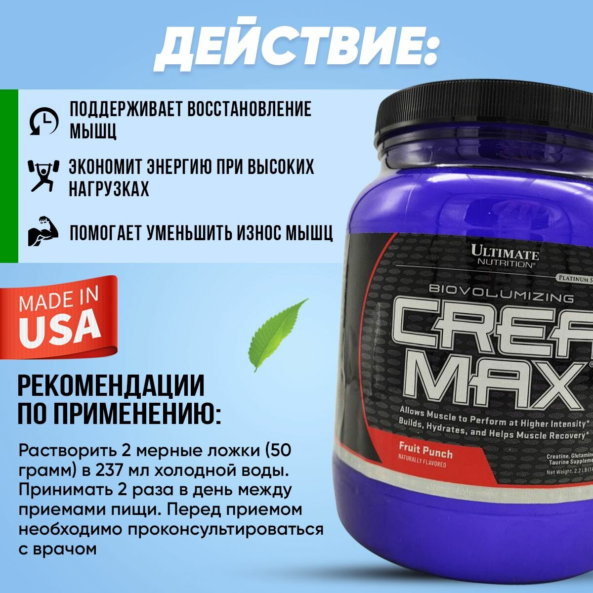 Ultimate Nutrition Crea Max Powder, Креатин моногидрат с глютамином и таурином для выносливости и набора мышечной массы, порошок 1000 г со вкусом фруктового пунша интересное: