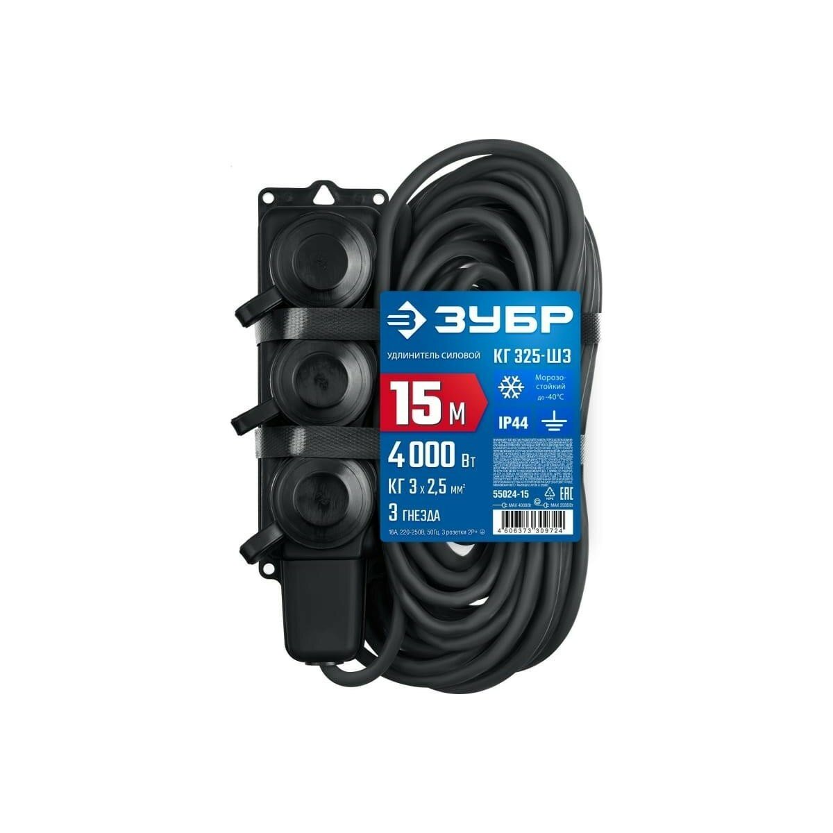 ЗУБР КГ 325-Ш3 КГ 3х2.5 IP44, 15м 3гн. 4000ВтСиловой удлинительПрофессионал, (55024-15)