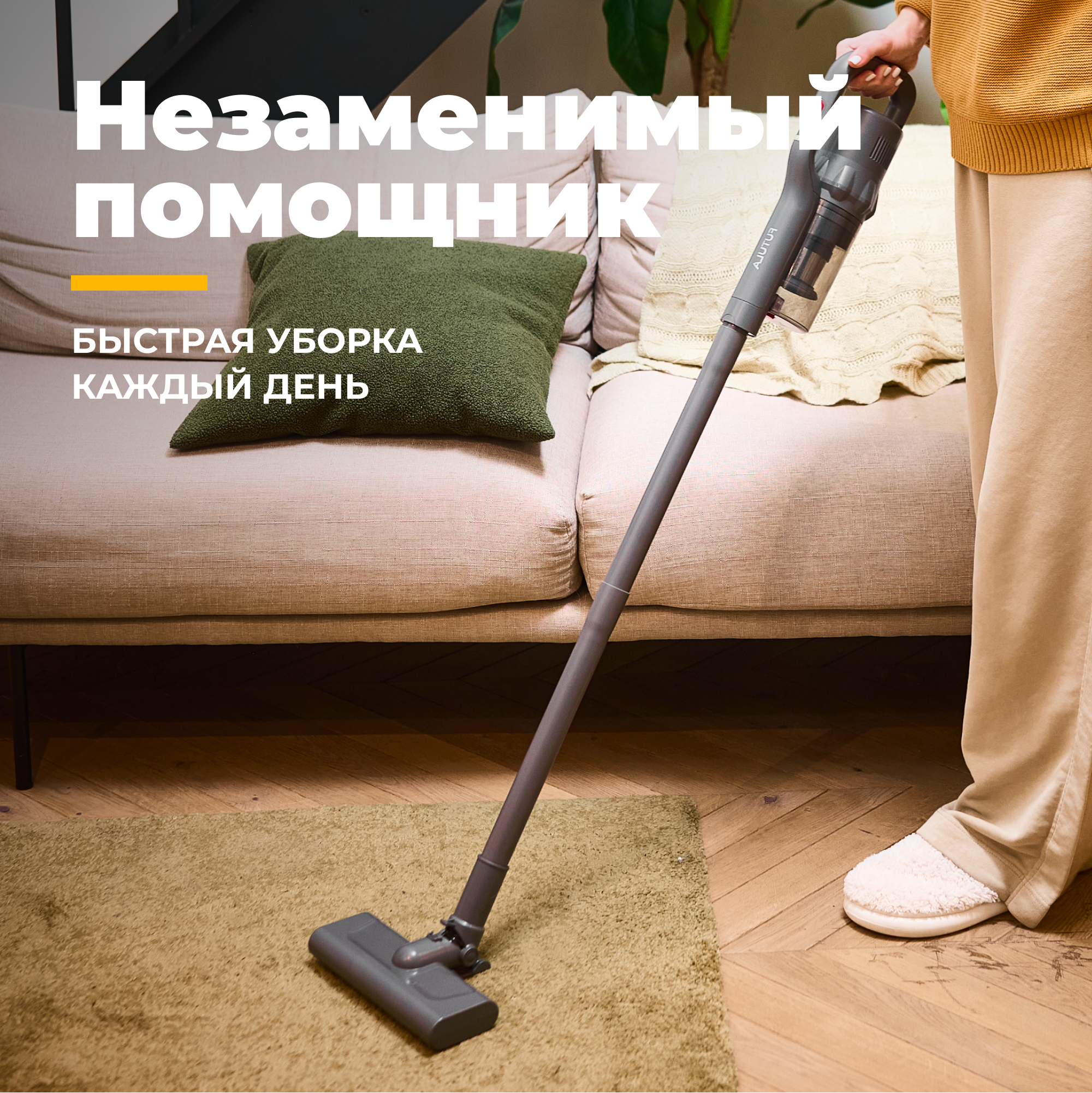 Беспроводной, выглядит стильно, для ежедневной уборки гладкой поверхности подойдёт