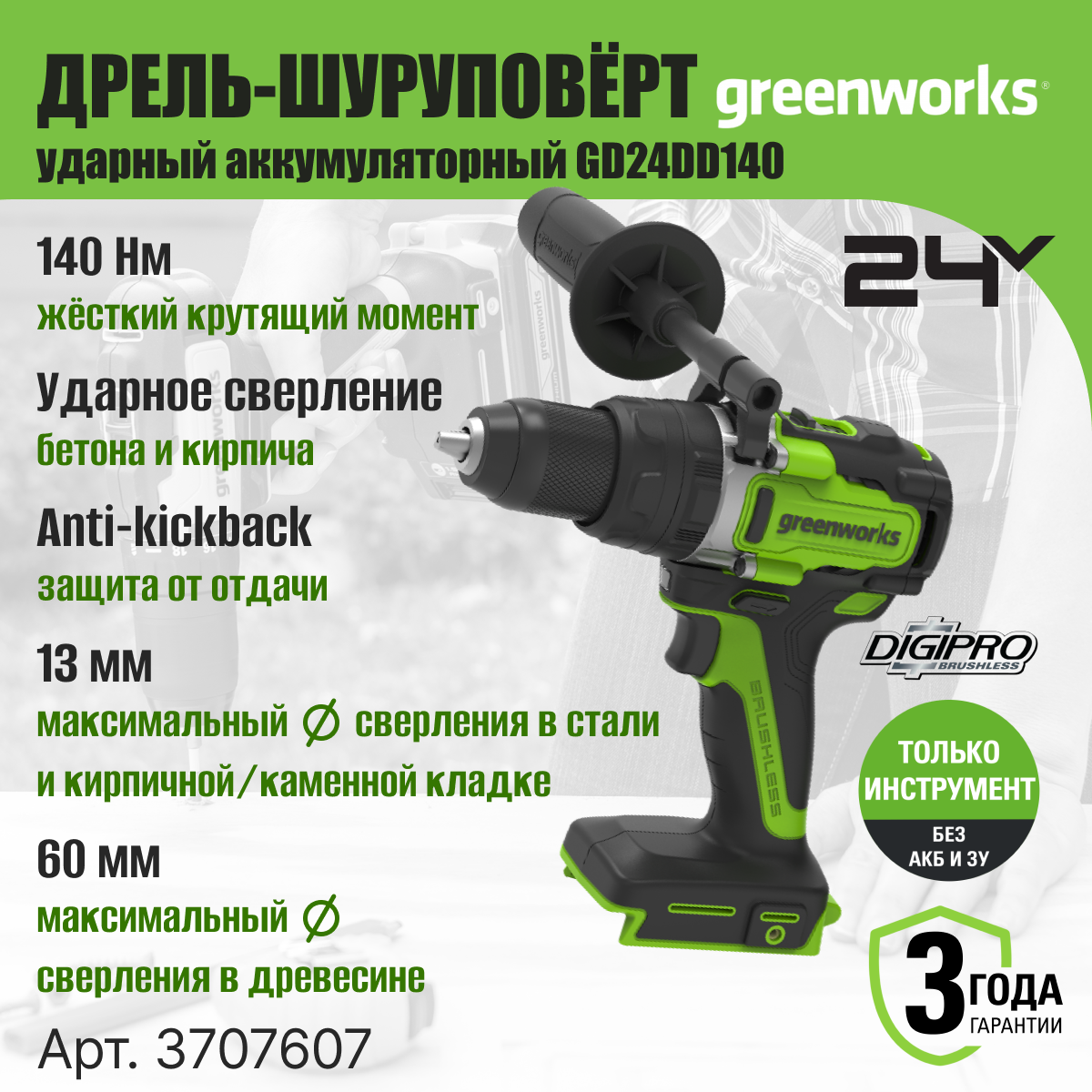 Дрель-шуруповерт аккумуляторная GreenWorks GD24DD140, 24V, 140 Нм, бесщеточная, без АКБ и ЗУ (3707607)