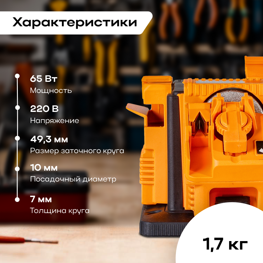 комплектация: станок заточной, насадка для заточки сверл, насадка для заточки стамесок и лезвий, насадка для заточки ножей и ножниц, заточной круг, паспорт