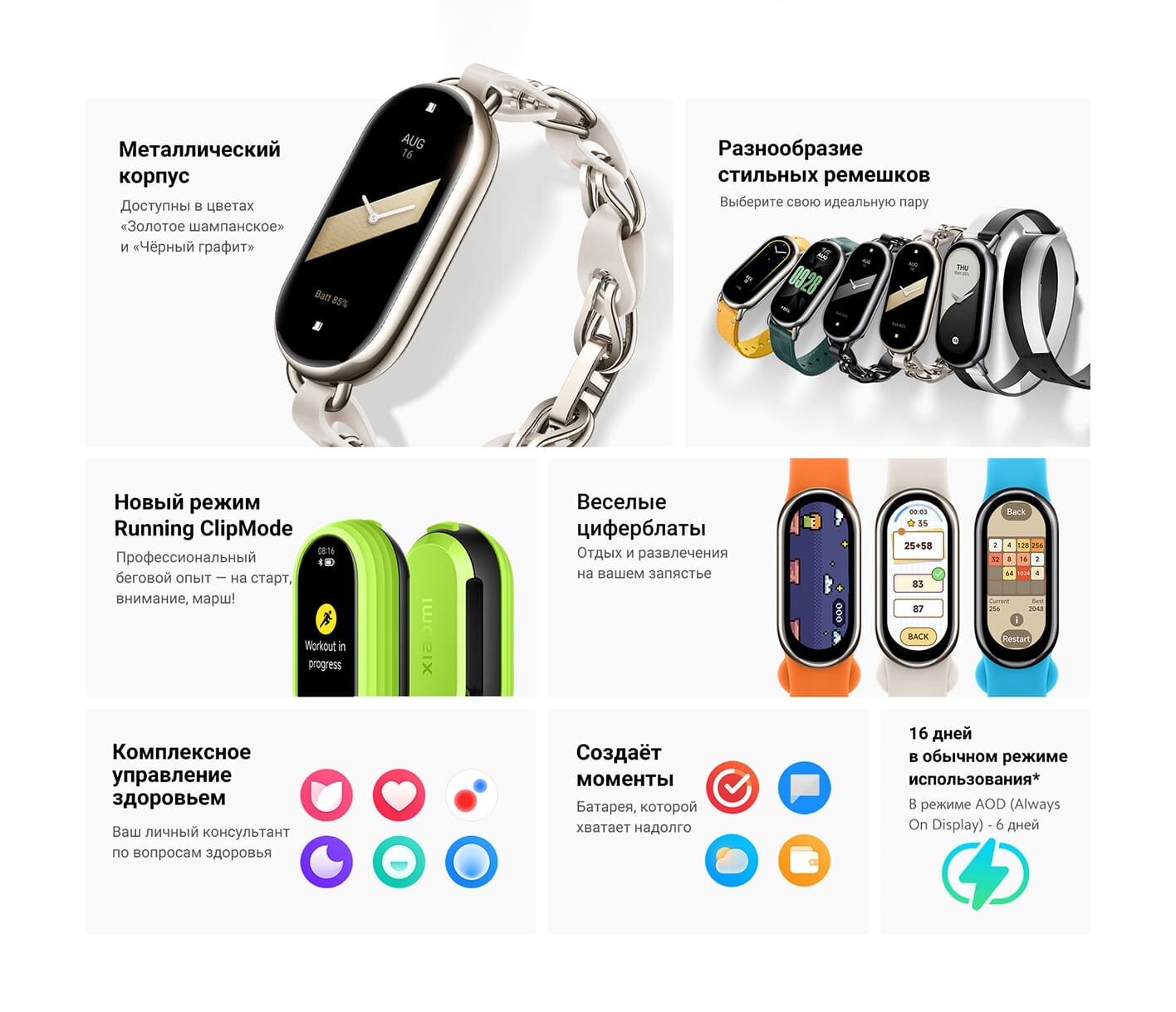 | Дополнительная информация | отслеживание показателей женского здоровья; персональный индекс активности; мониторинг уровня стресса; дыхательное упражнение; продолжительность восстановления; приложение: Mi Fitness; яркость: до 600 нит, регулируемая; отслеживание качества дыхания во время сна |