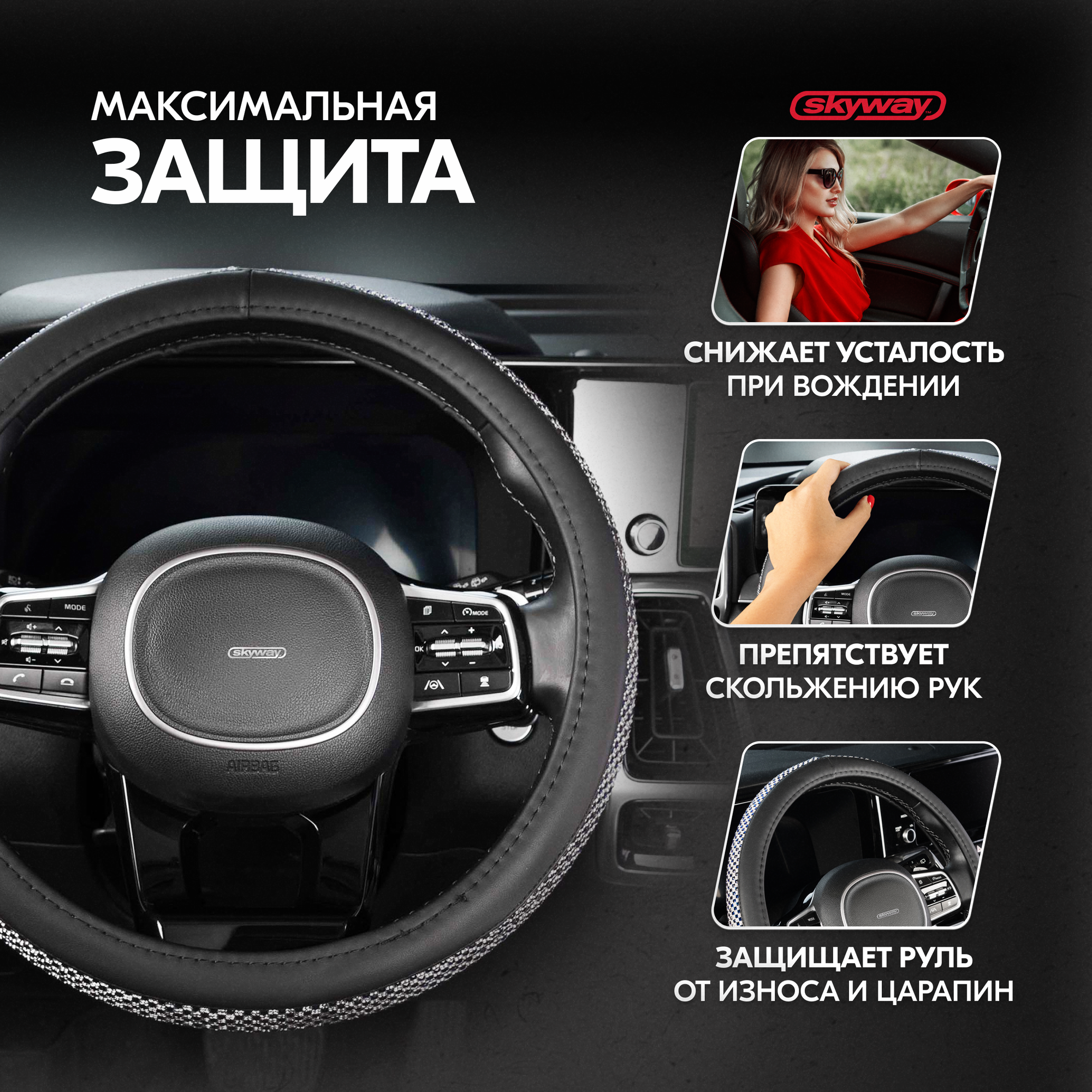 SKYWAY S01102461 Оплетка на руль M-38см, экокожа, чернаясеребряные стразы