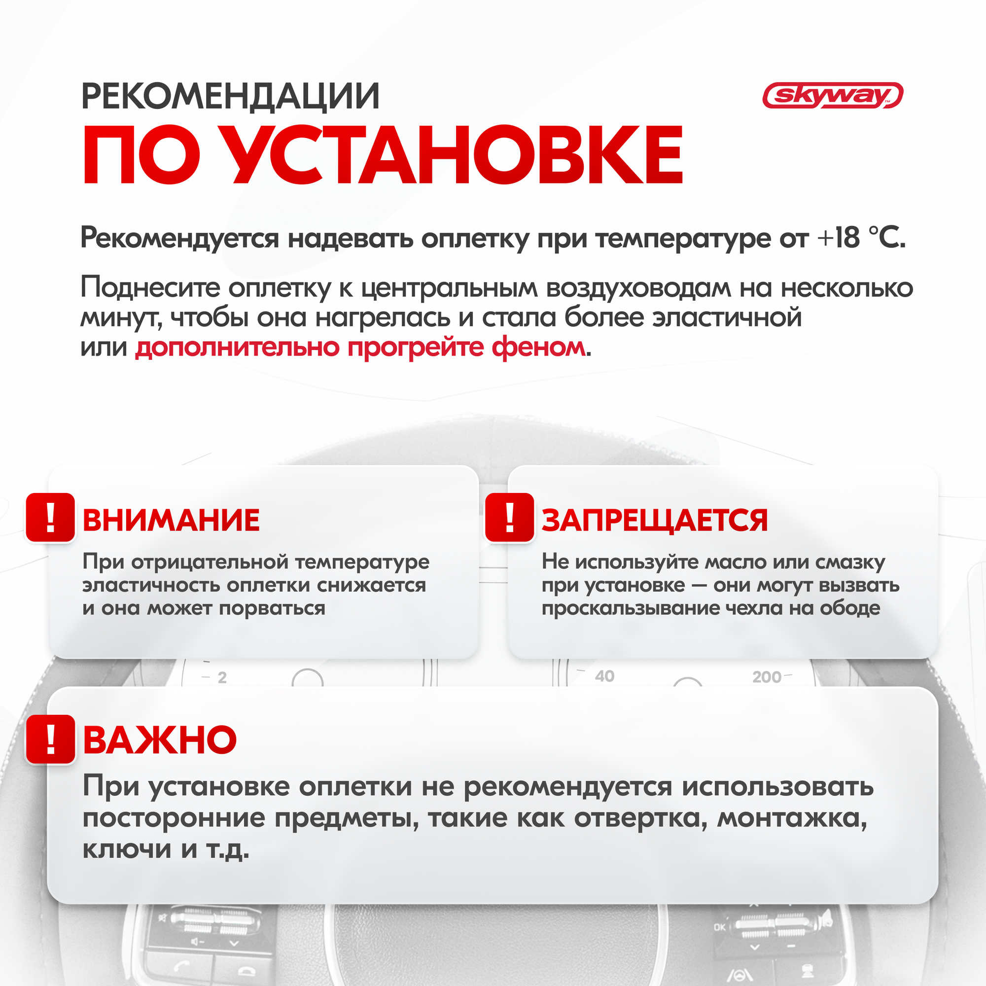 | Дополнительная информация | Рекомендации производителей: выбирайте оплетку под размер вашего рулевого колеса. Неверно выбранный размер может стать причиной проскальзывания оплётки или привести к невозможности снять или надеть её на руль. |