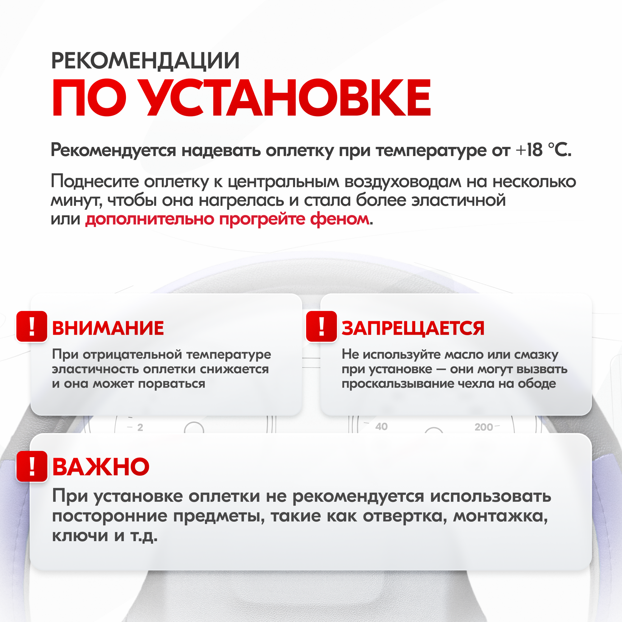 | Дополнительная информация | Рекомендации производителей: выбирайте оплётку под размер вашего рулевого колеса. Неверно выбранный размер может стать причиной проскальзывания оплётки или привести к невозможности снять или надеть её на руль. |