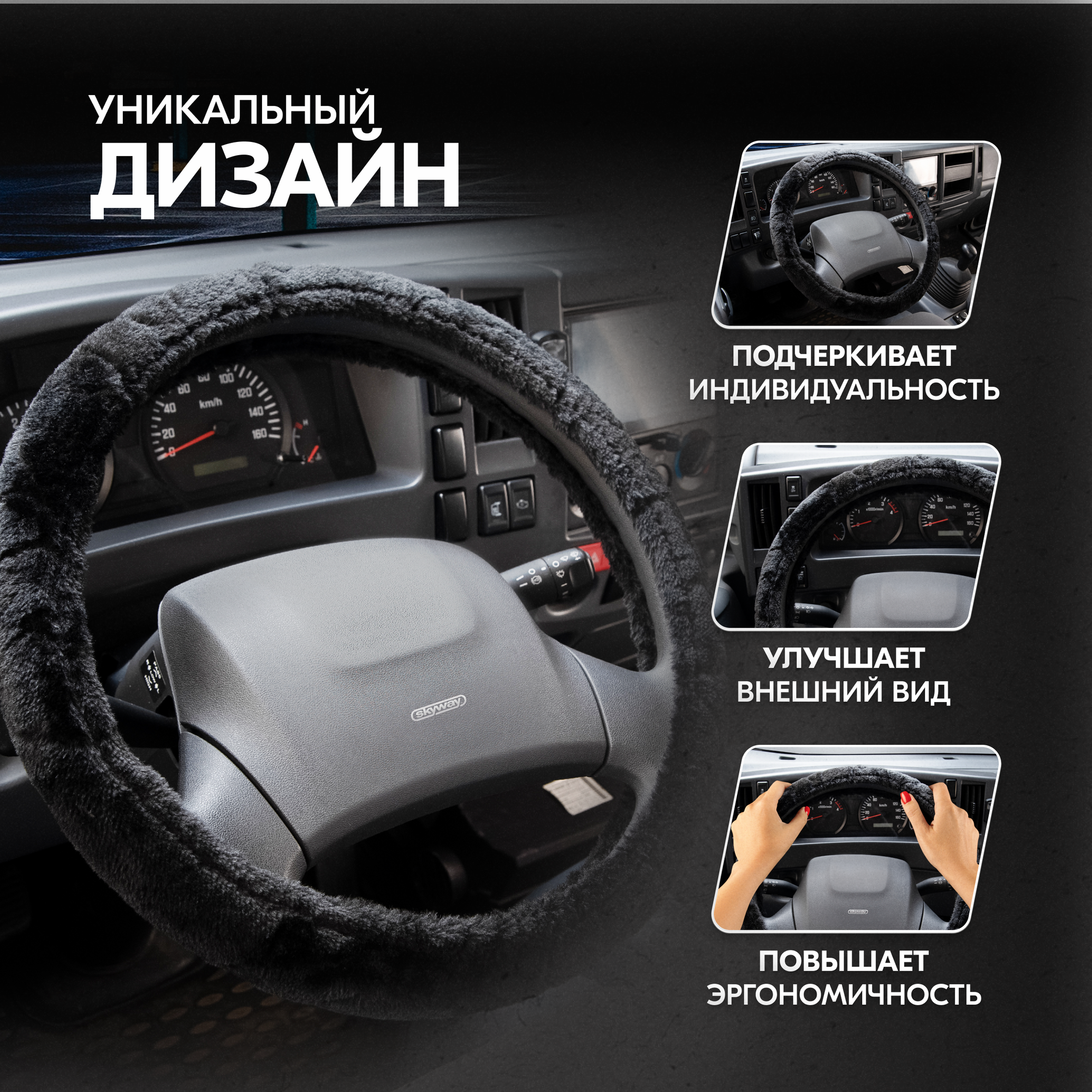 Оплётка руля SKYWAY меховая искуст черная ECO (L)
