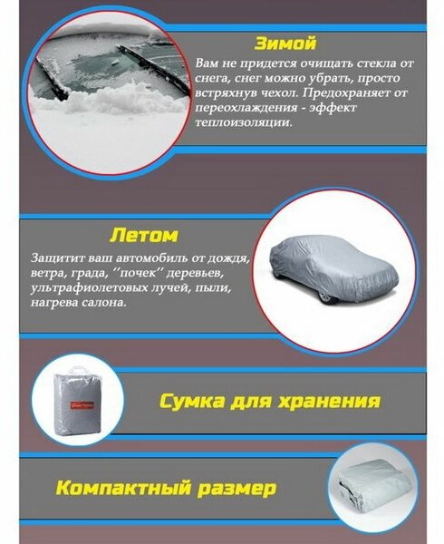 | Минусы: | порвался при установки на авто в местах для зеркал заднего вида. На столько лёгкий ,что ветром поднимает с машины, даже завязки на дисках не помогают. Это летом, а,что будет зимой..... |