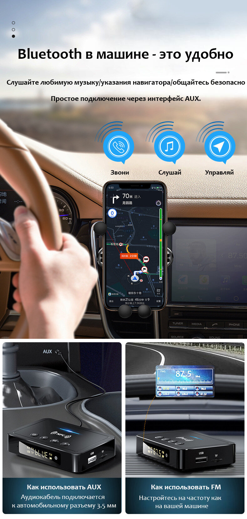 | Плюсы: | реально удобно для тех к кого нет блютуз а в машине,можно также использовать и дома. Не фонит |