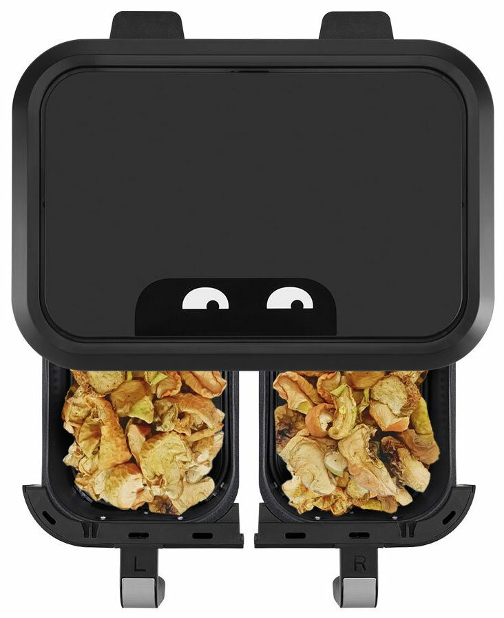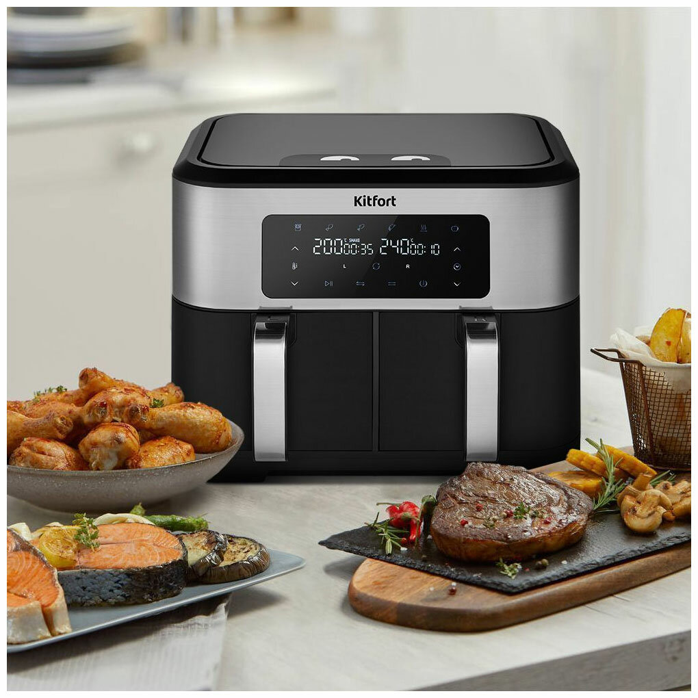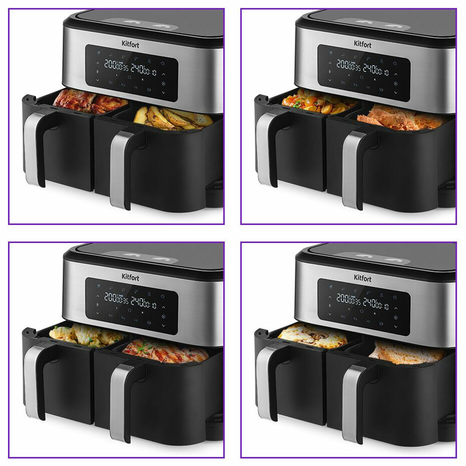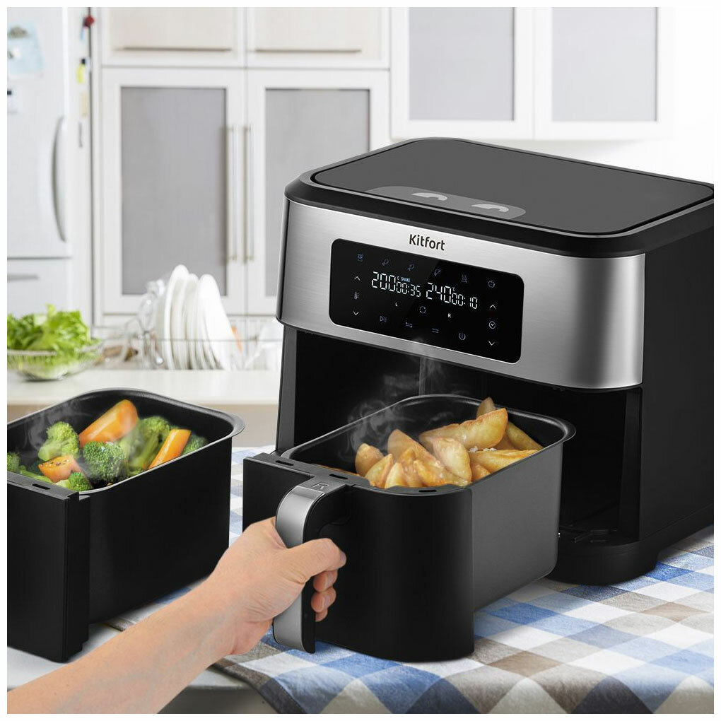 2 Два отсека. Возможно готовить сразу два блюда. Например курочку и картошку фри 3. Большой объем отсеков. На всю семью или компанию хватает. 4. Красивый. Стильный. 5. Готовка без масла - залог здоровья. |