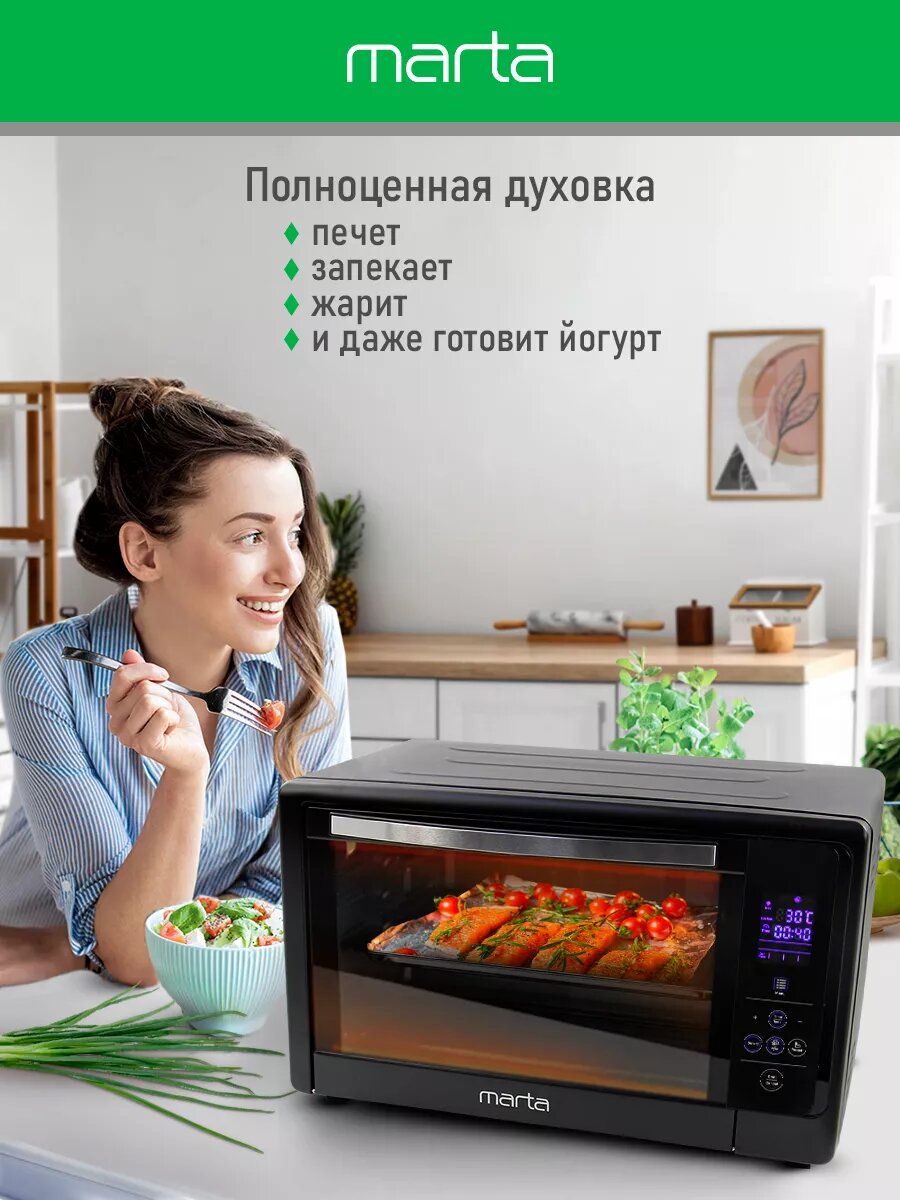 Мини-печь MARTA MT-EO4287A (50 литров, сенсор+конвекция+шашлычница+вертел) черный жемчуг