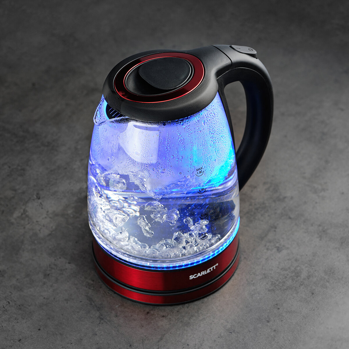Мощный чайник из прочного стекла с красно-черным дизайном используем на работе для приготовления кофе или чая и быстрых обедов в перерыв. Закипает быстро, поэтому приготовление занимает считанные минуты. Работа его сопровождается подсветкой, автоматически отключается при закипании.