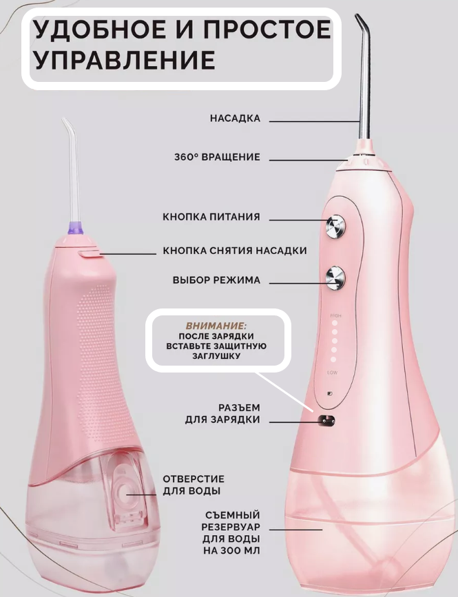Беспроводной ирригатор Pink 8 насадок/ 5 режимов и 5 уровней мощности интересное: