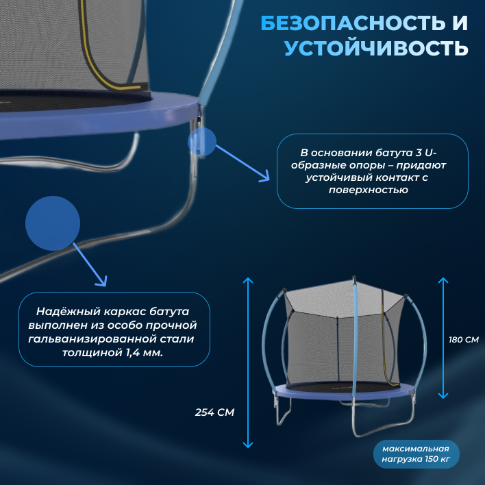 | Состав набора | каркас батута, прыжковое полотно, защитная сетка, инструкция |
