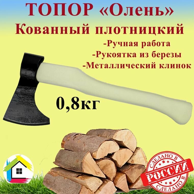 Топор кованый "Олень" с деревянным клином ТопАр 0,8 кг ручной сборки/Деревянное топорище 400 мм из березы с биозащитным составом