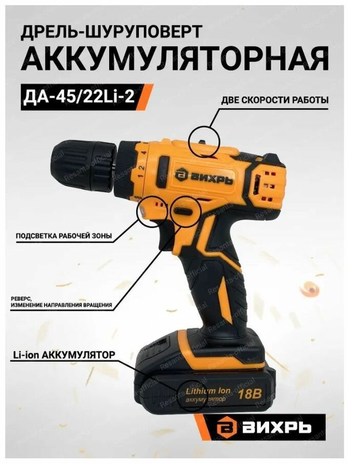 Дрель-шуруповёрт Вихрь ДА-45/22Li-2, 18В, быстрозажимной патрон, 2Ач