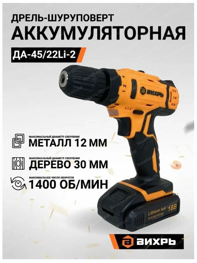 Дрель-шуруповерт аккумуляторная ДА-45/22Li-2 Вихрь, 18В, 1 акб и ЗУ, в коробке интересное: