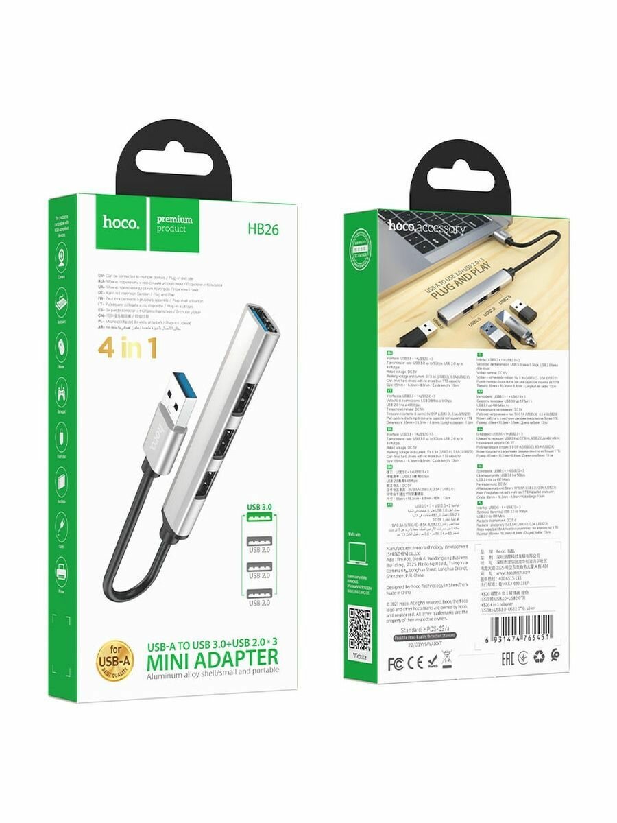 Адаптер Hoco Hb26, 4 в 1, USB - Usb3.0/usb2.0*3, длина кабеля 13 см, серебристый Hoco 9881634