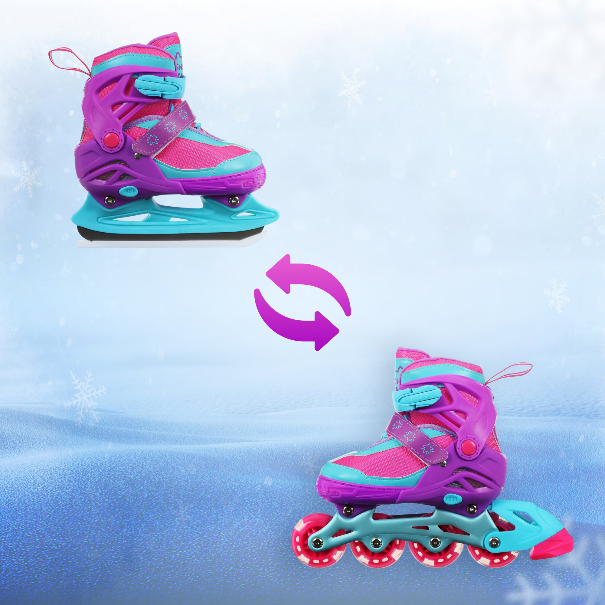 Коньки ледовые детские раздвижные Snow Cat, с роликовой платформой, р. 30-33, цвет розовый, голубой