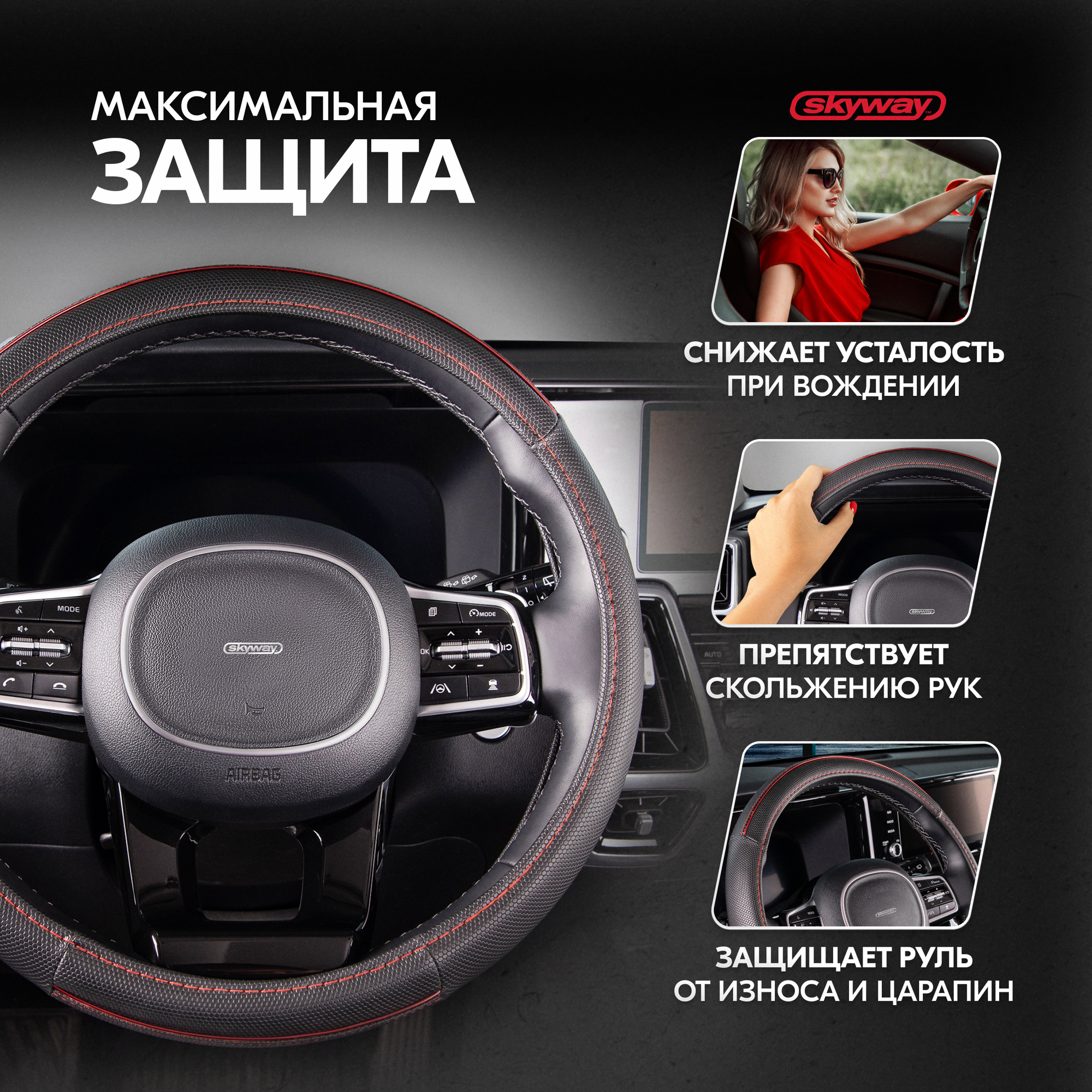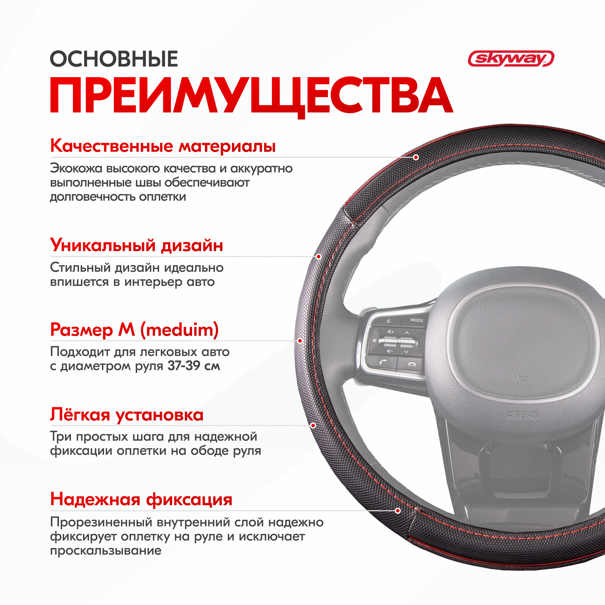 Оплетка руля SKYWAY Combo 3 M 37/38/39 см, экокожа, черно-красный, S01102359