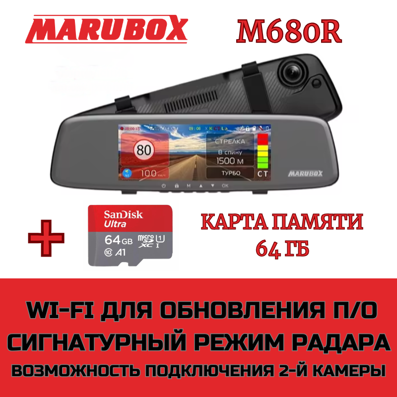 Видеорегистратор с радар-детектором Marubox M680R + доп. камера Marubox M68FHD + карта памяти 64Gb