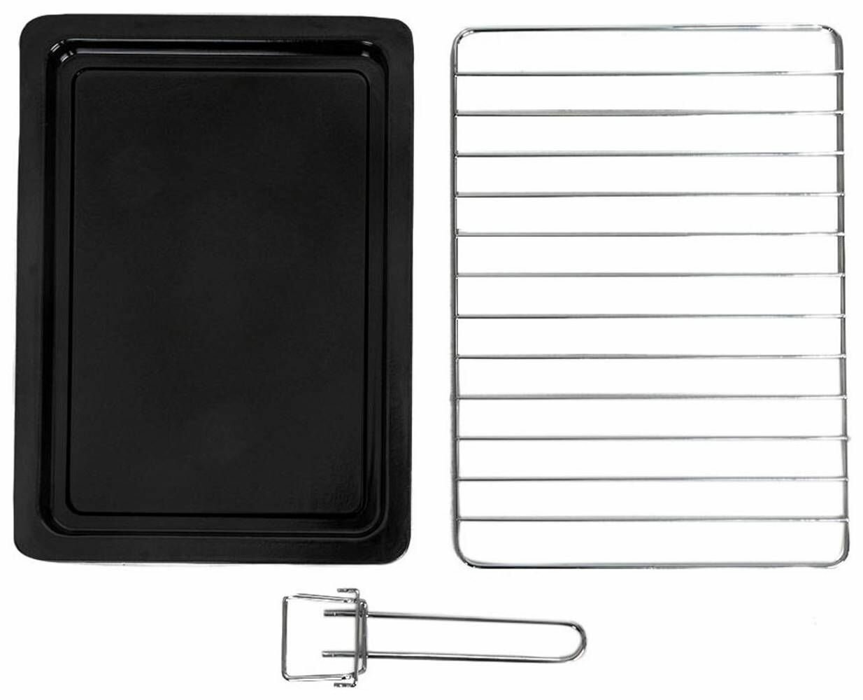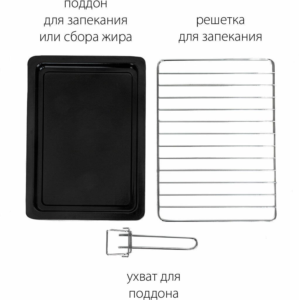 | Комплектация | вертел / держатель для противня/решётки / поддон для сбора крошек / противень / решётка / ухват |