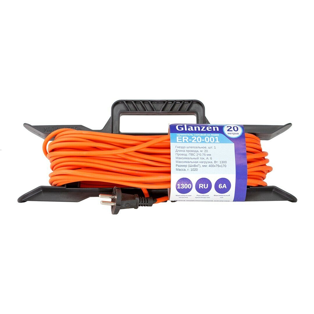 Удлинитель силовой на рамке GLANZEN штепсельное гнездо ПВС 2*0.75 10 м 1300 Вт ER-10-001