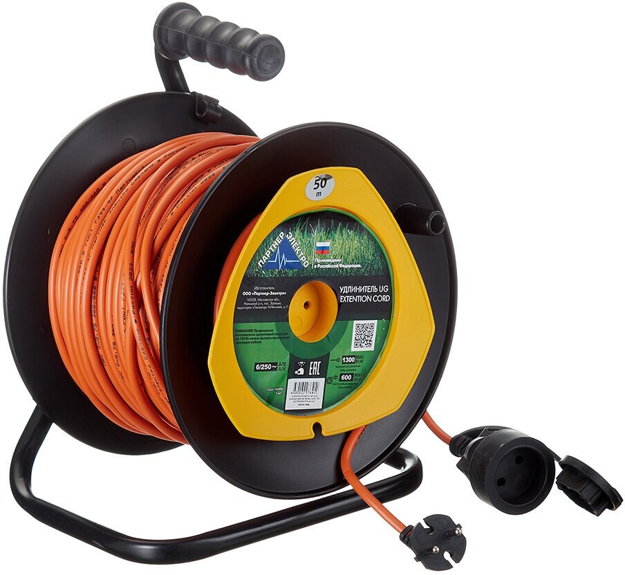Удлинитель Партнер Электро без заземления 50 м на катушке 1,3 кВт 1 розетка ПВС 2х0,75 кв. мм IP44