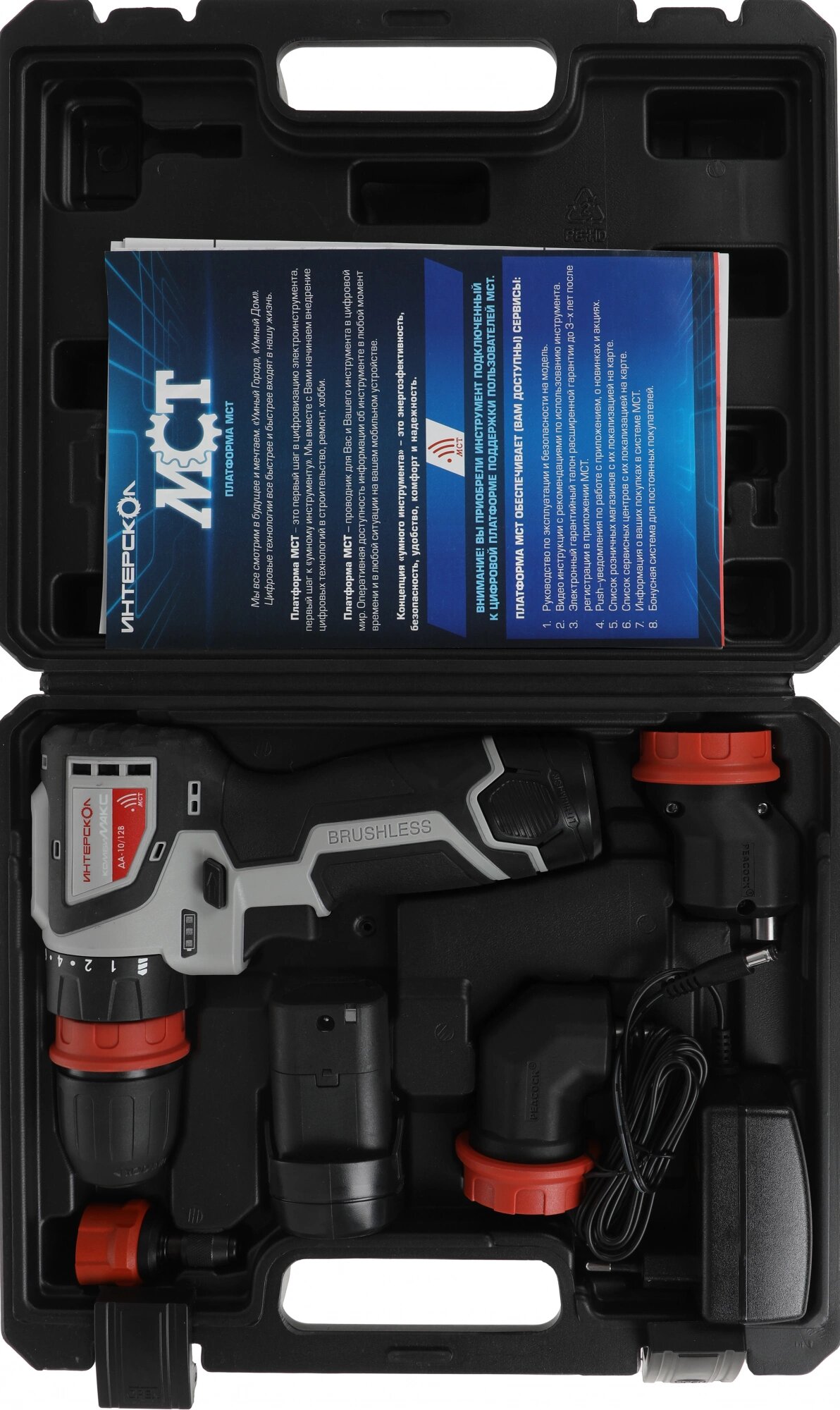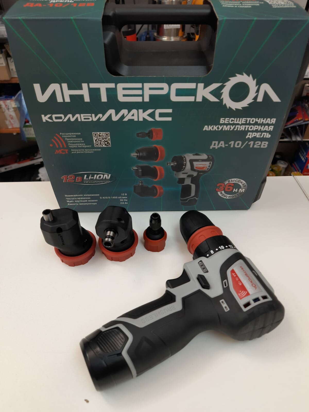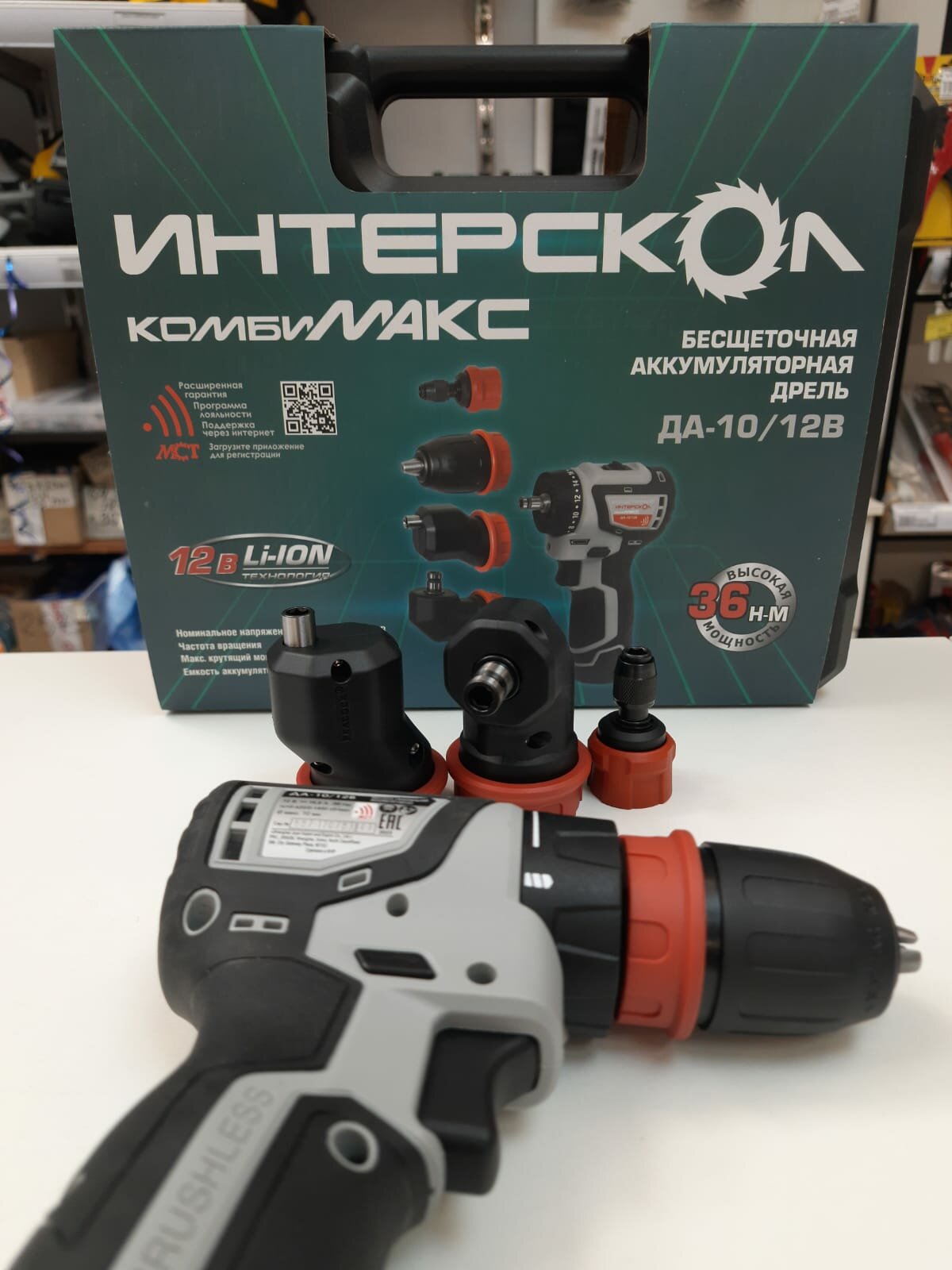 Бесщеточная аккумуляторная дрель-шуруповерт Интерскол комбимакс ДА-10/12В 36, Li-ion, кейс, 2 аккум., 2Ач, 4 насадки