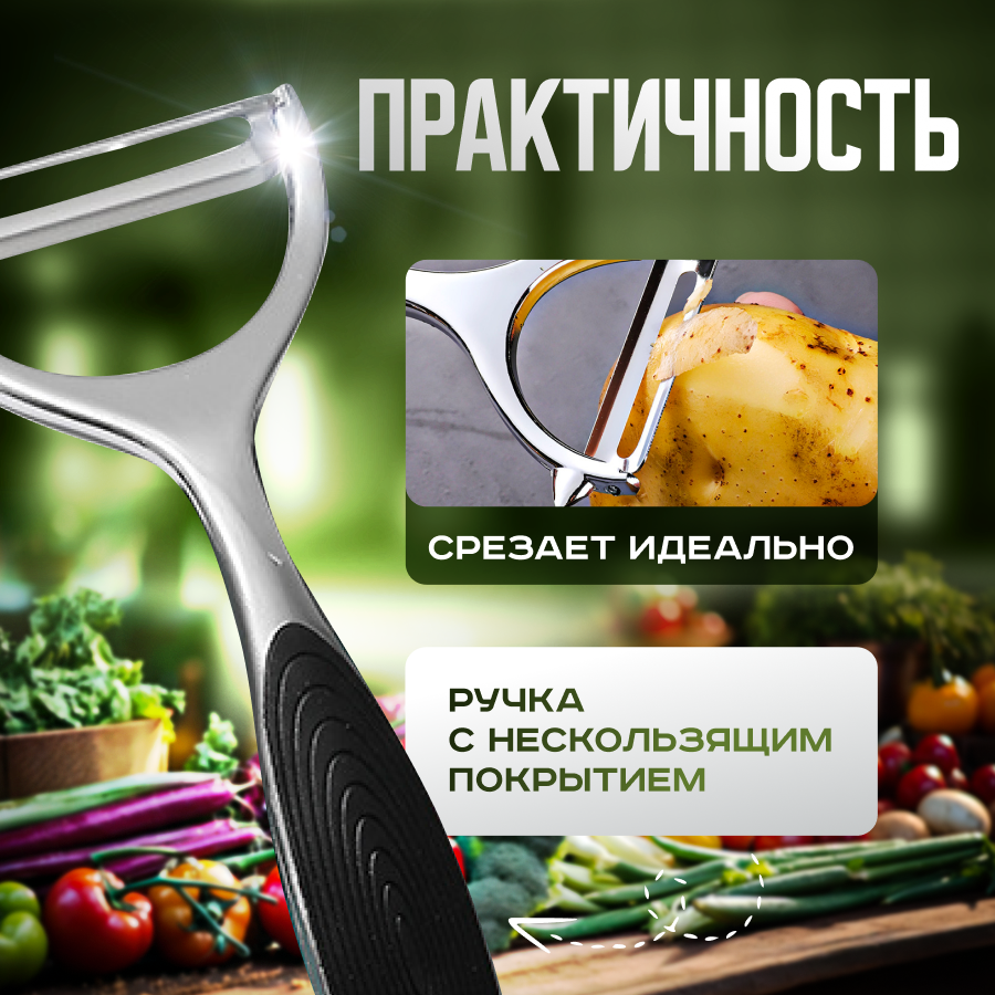 | Плюсы: | Очень легко режет, не надо прилагать усилие. Просто "гладишь" овощ, хоп-хоп, и он чистый.