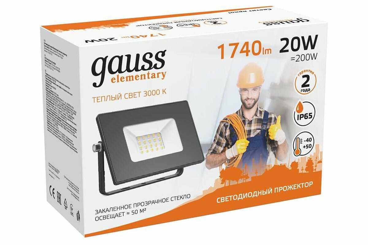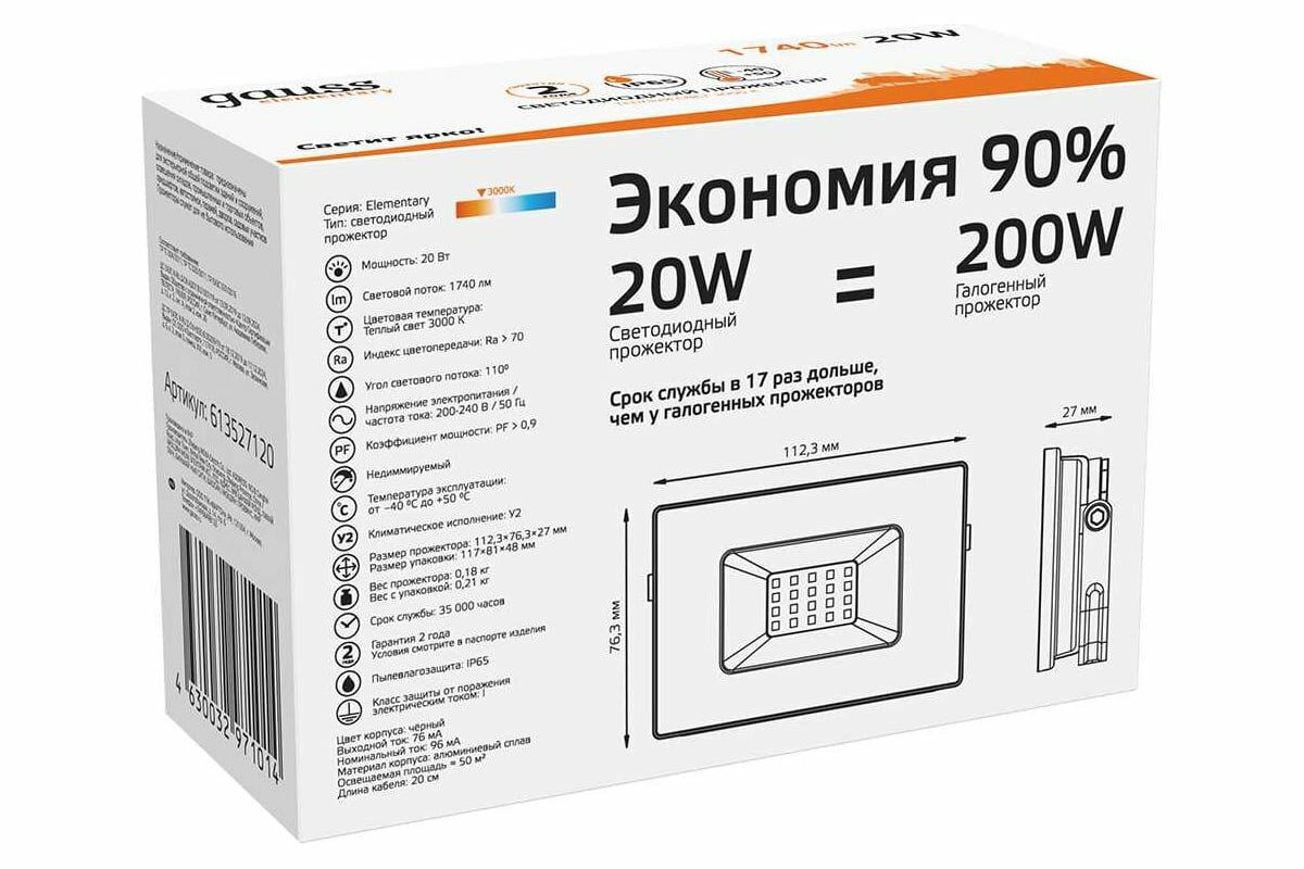 Прожектор светодиодный LED до 20 Вт 1740 Лм 3000К IP65 112х76х27 мм Elementary, GAUSS 613527120 (1 шт.)