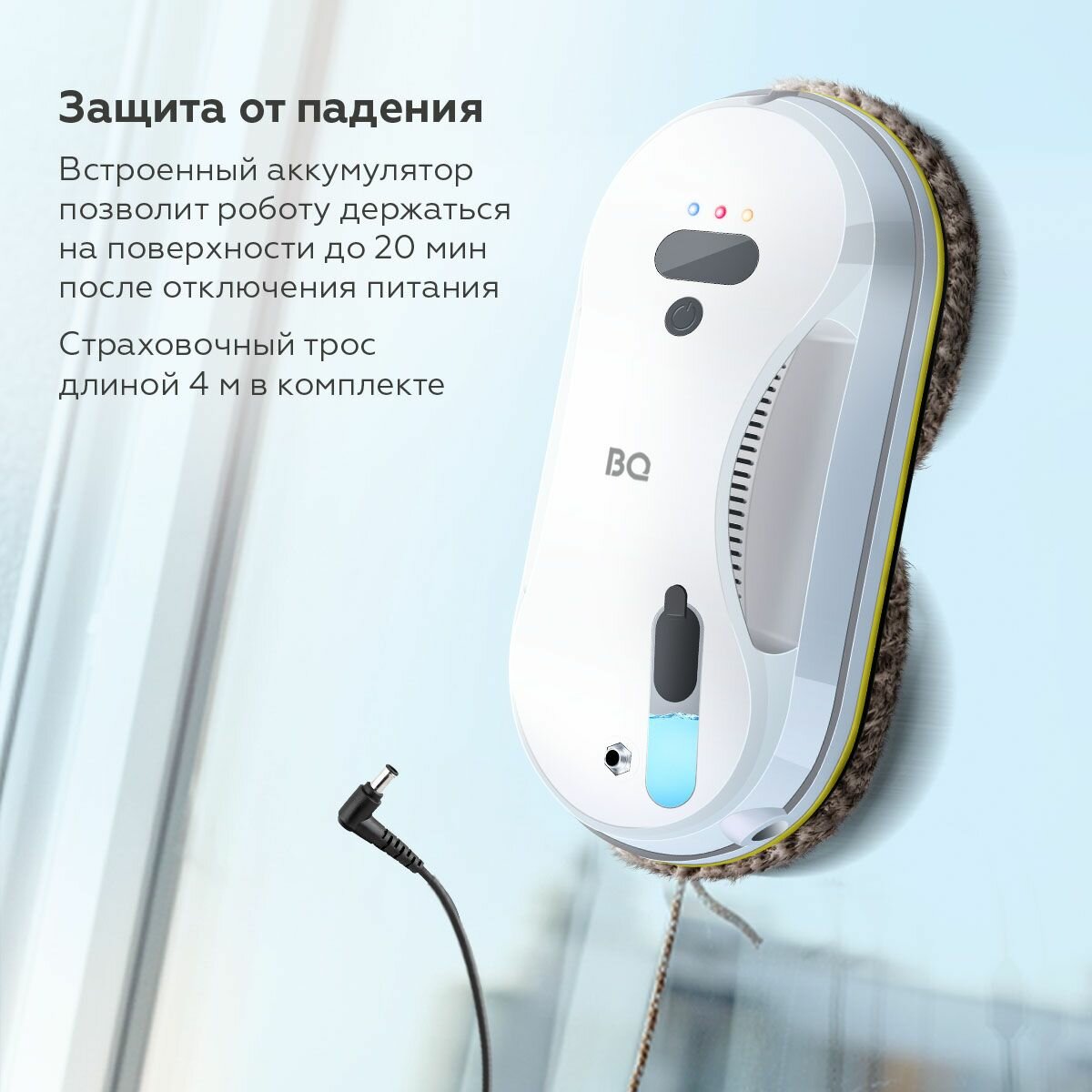 Робот-мойщик окон BQ WR200S White. Мощность 80 Вт/Объем для чистящего средства 110мл/Параметры электропитания 100-240 В,50-60 Гц/Страховочный трос 4м/Минимальная рабочая зона 40х40см/Для всех видов гладких поверхностей: кафель, ламинат, стекло"