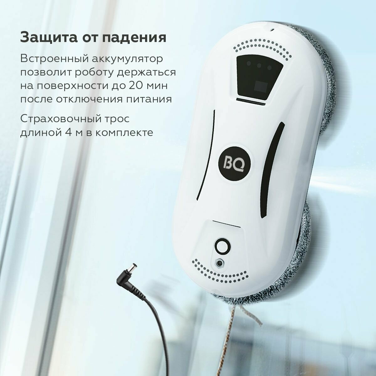 Робот-мойщик окон BQ WR200S White. Мощность 80 Вт/Объем для чистящего средства 110мл/Параметры электропитания 100-240 В,50-60 Гц/Страховочный трос 4м/Минимальная рабочая зона 40х40см/Для всех видов гладких поверхностей: кафель, ламинат, стекло"