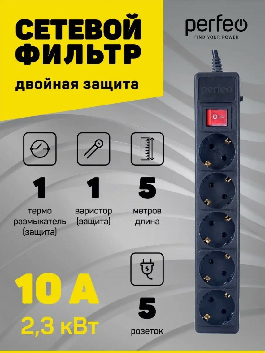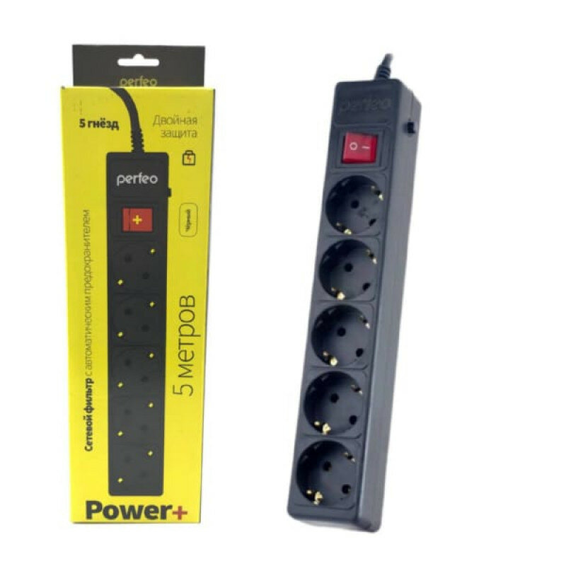 Сетевой фильтр Perfeo "power+", 5,0м, 5 розеток, черный (pf-pp-5/5,0-b) .