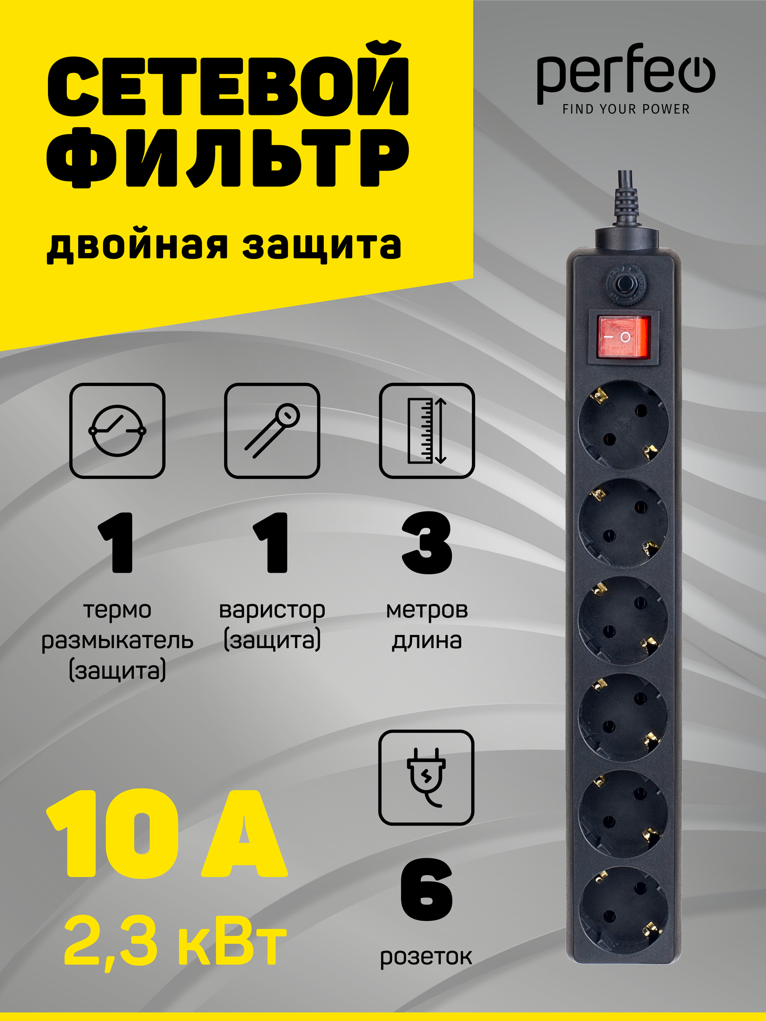Купить Сетевой фильтр Perfeo POWER+ 3,0м, 6 розеток, черный