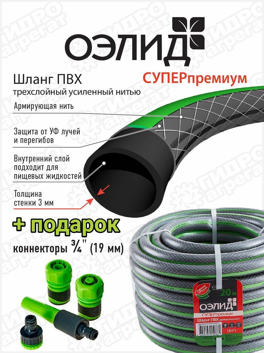 Шланг поливочный ПВХ Гидроагрегат "оэлид супер" , Д3/4(20м) 3х сл. премиум (набор салат.коннект.) ,шт