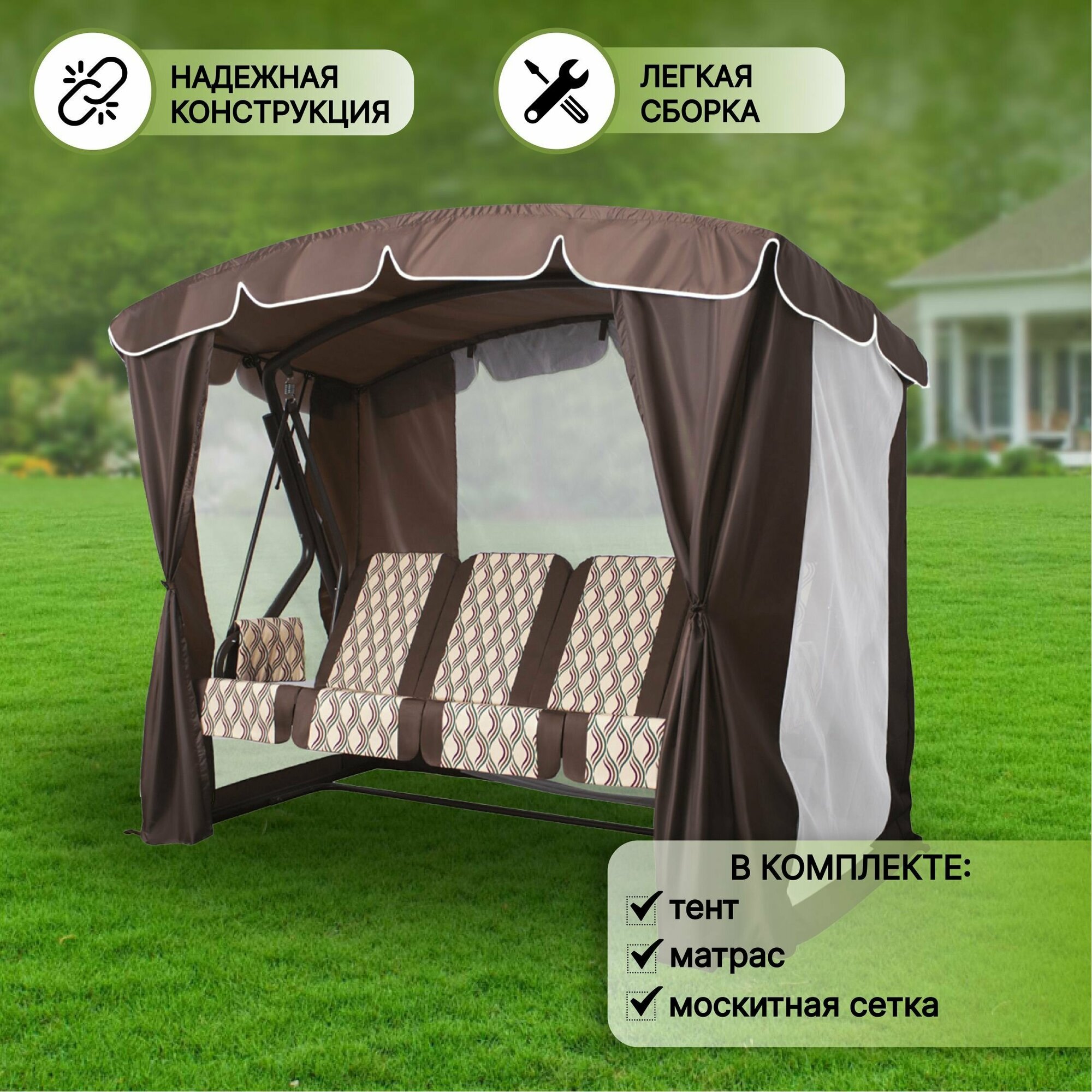Качели садовые 4-х местные Ольса Шатер ткань панама каркас коричневый, ткань полоска бежево-коричневная