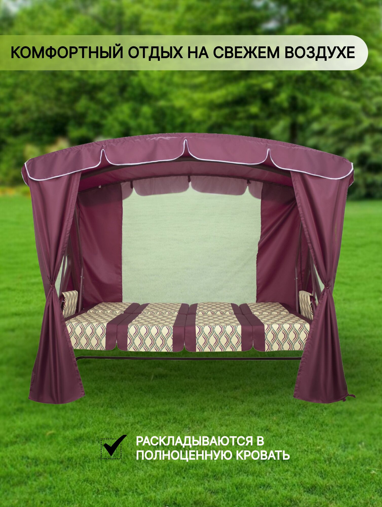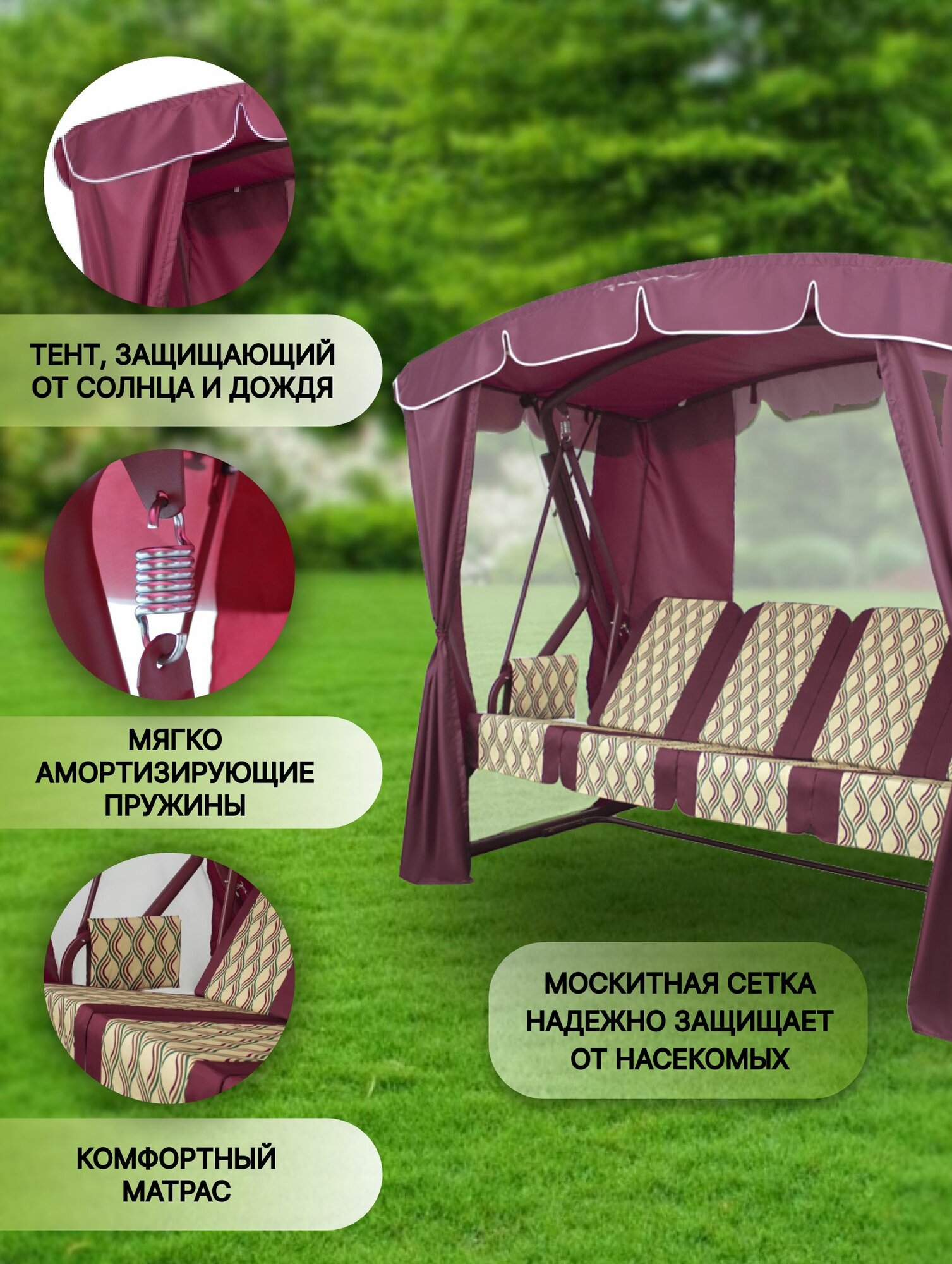 Садовые качели оазис люкс плюс для дачи уличные 4-местные подвесные с тентом и москитной сеткой бордовый интересное: