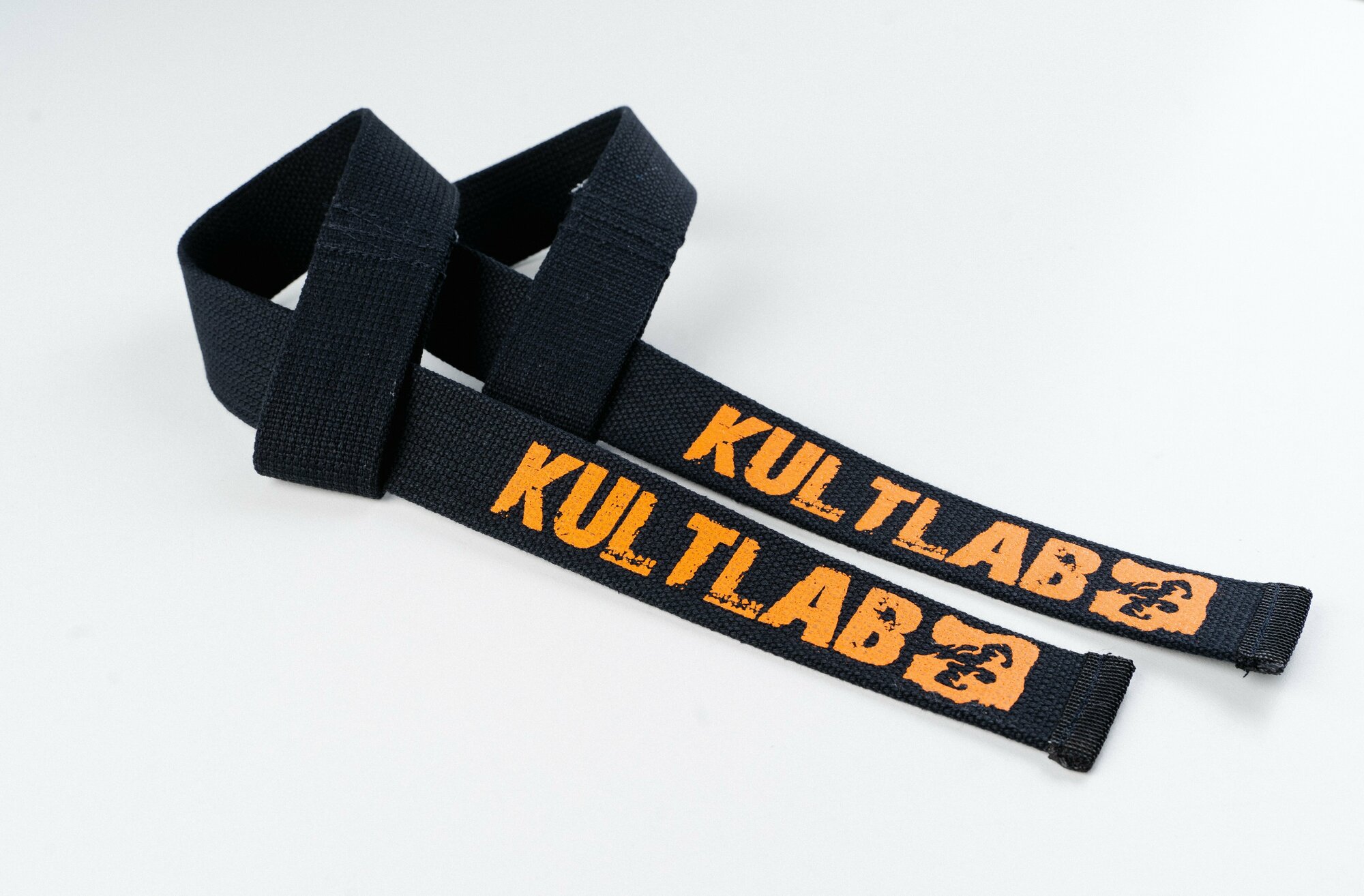 Спортивные лямки Kultlab для тяги, грифа, турника с оранжевой надписью интересное: