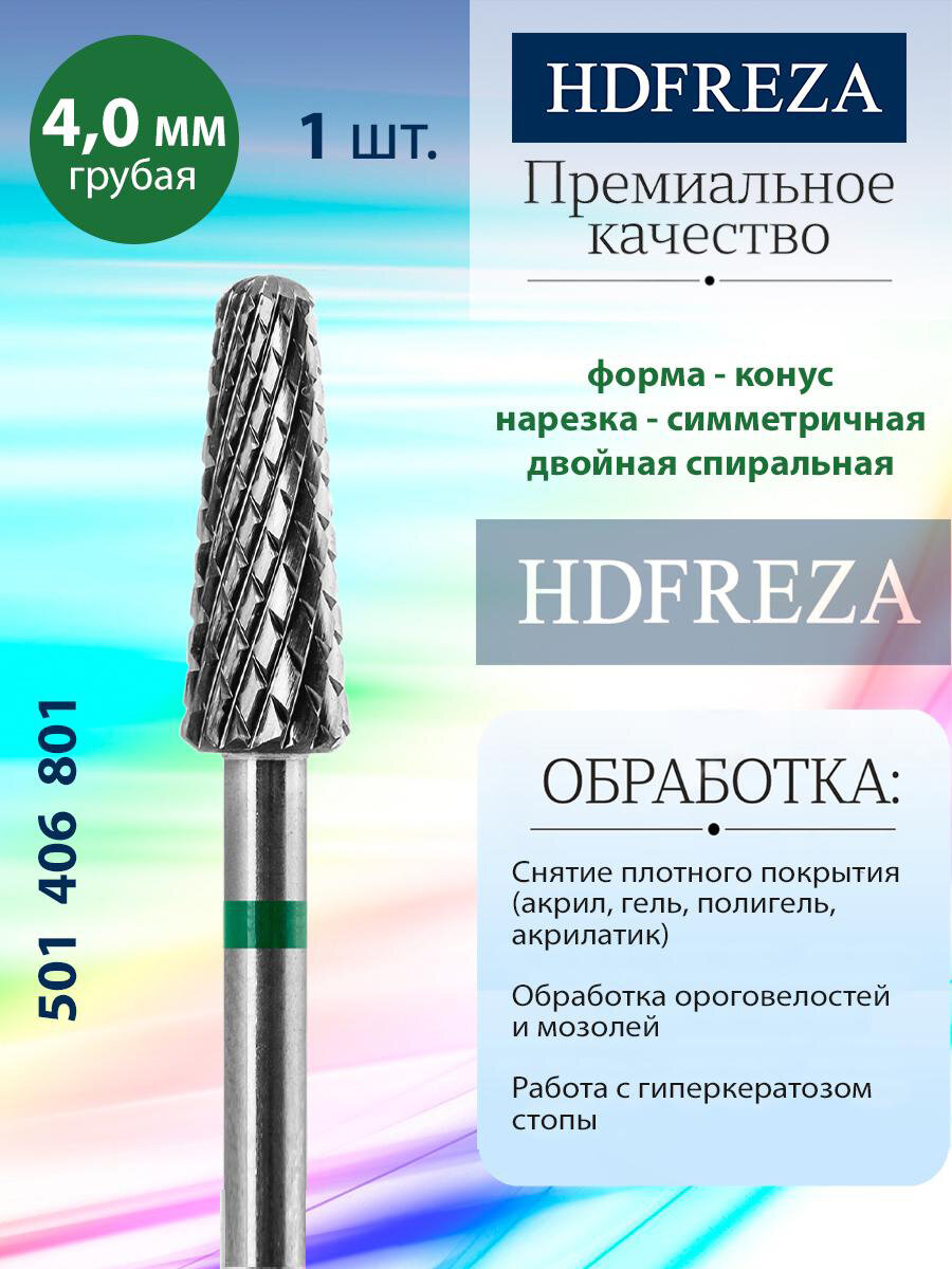 Фреза для маникюра и педикюра HDFREZA твердосплавная для снятия покрытия 501 406 801 Грубая зеленая конус d-4.0 интересное: