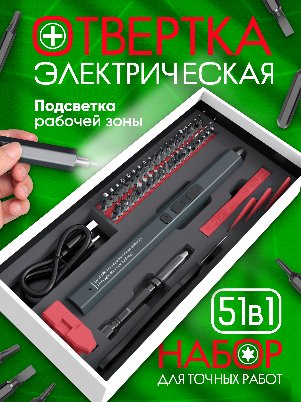 Отвертка аккумуляторная электрическая 51в1, с фонариком, серая