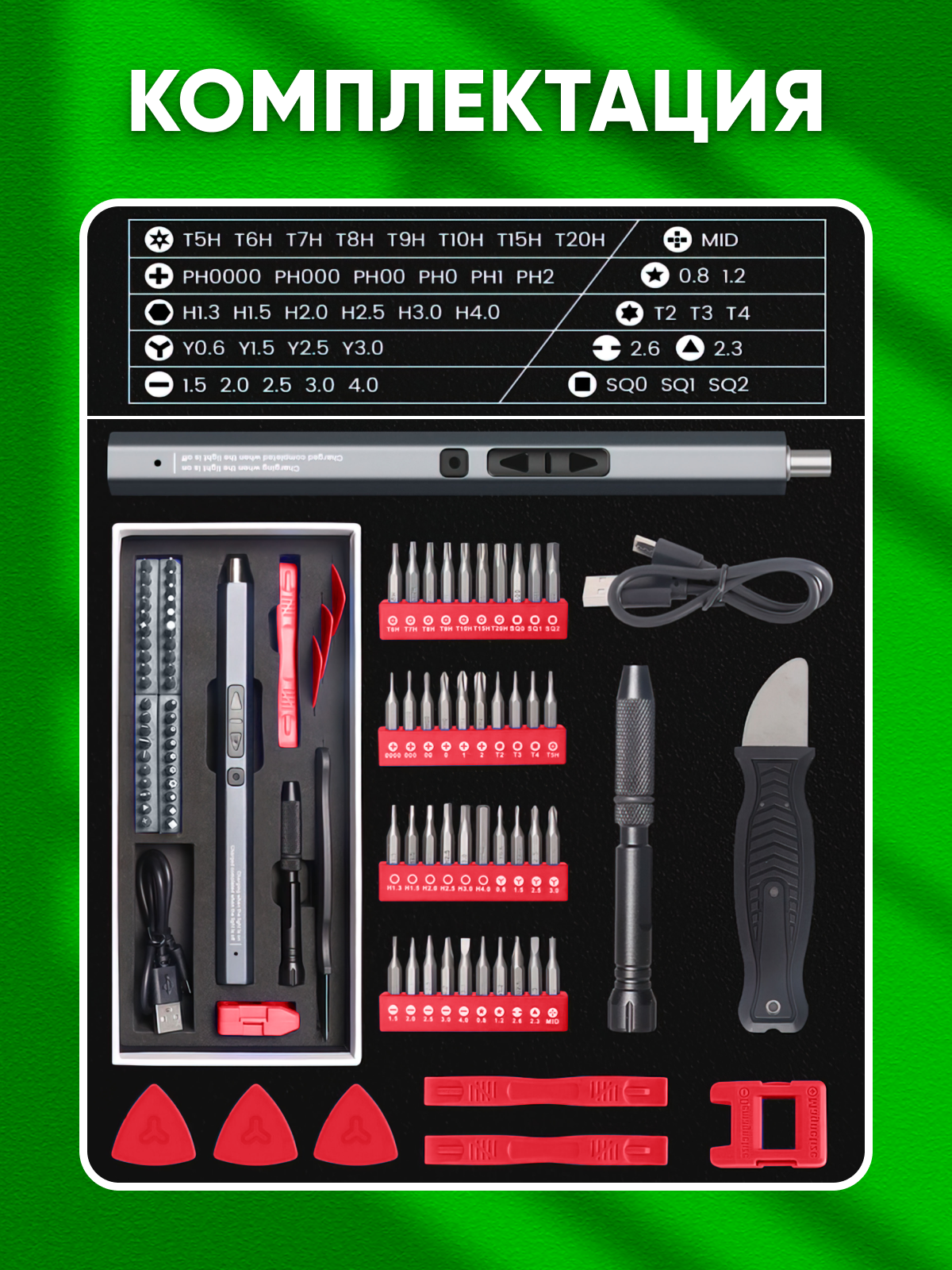 | Комплектация | Насадки шестигранника (мм) - H1.3, H1.5, H2.0, H2.5, H3.0, H4.0. Насадки шлица (крестовые) - PH0000, PH000, PH00, PH0, PH1, PH2. Насадки ключа TORX - T2, T3, T4, T5H, T6H, T7H T8H, T9H, T10H, T15H, T20H. Насадки торцевой отвертки (мм) - SL1.5, SL2.O, SL2.5, SL3.0, SL4.0. |