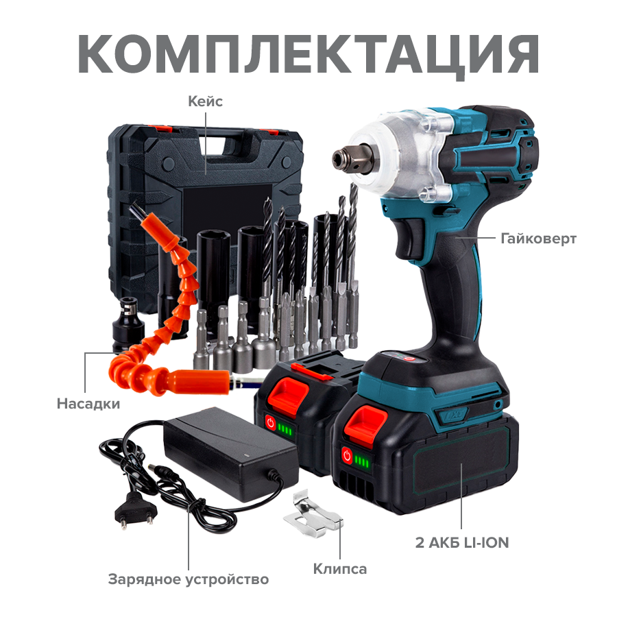 Гайковерт ударный синий Кейс+ 2АКБ (доп.аксессуары)