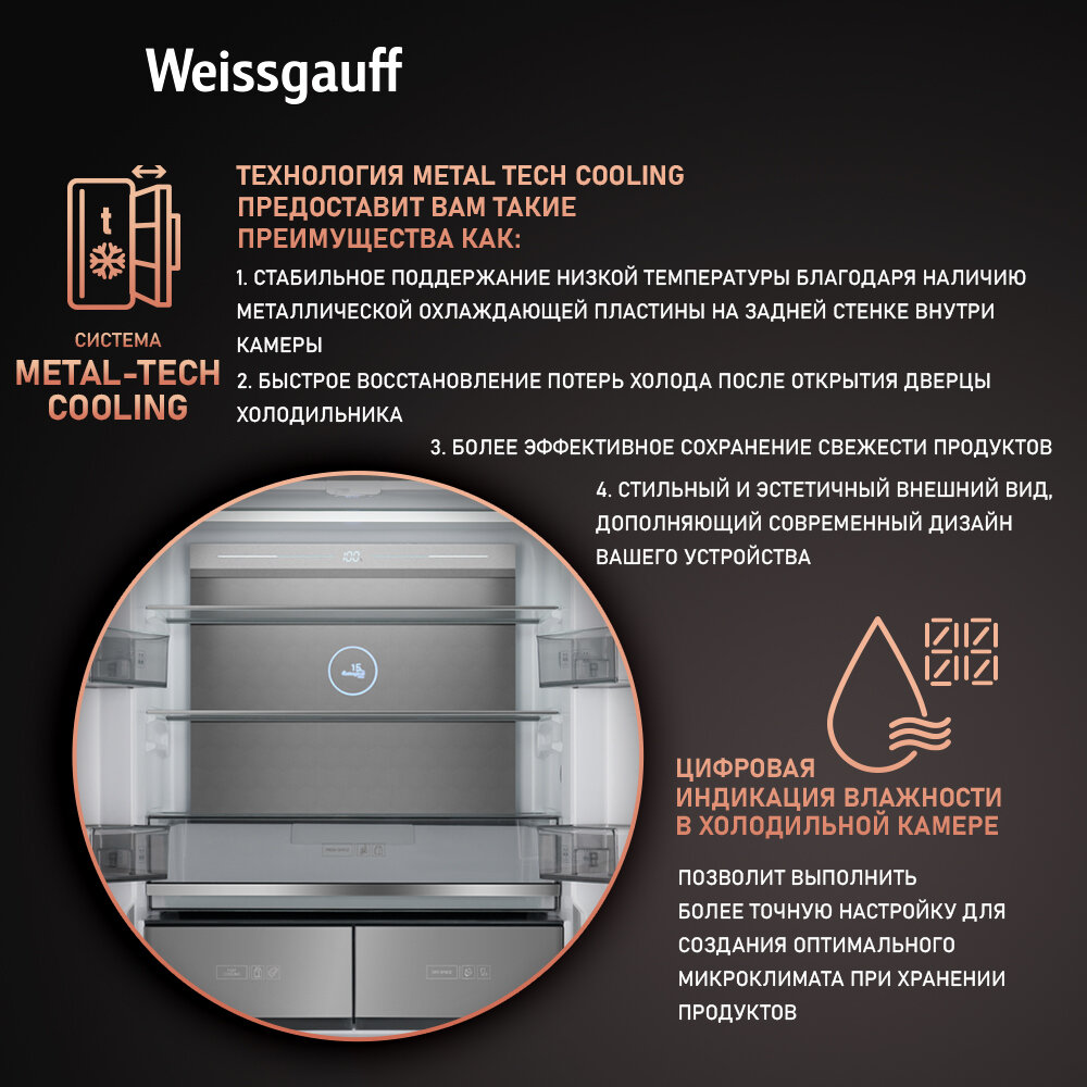 Отдельностоящий холодильник с инвертором Weissgauff WCD 590 Nofrost Inverter Premium Ecofresh Dark Inox 3 года гарантии, суперзаморозка, суперохлаждение, LED-освещение, технология Multi Air Flow и Metal-Tech Cooling