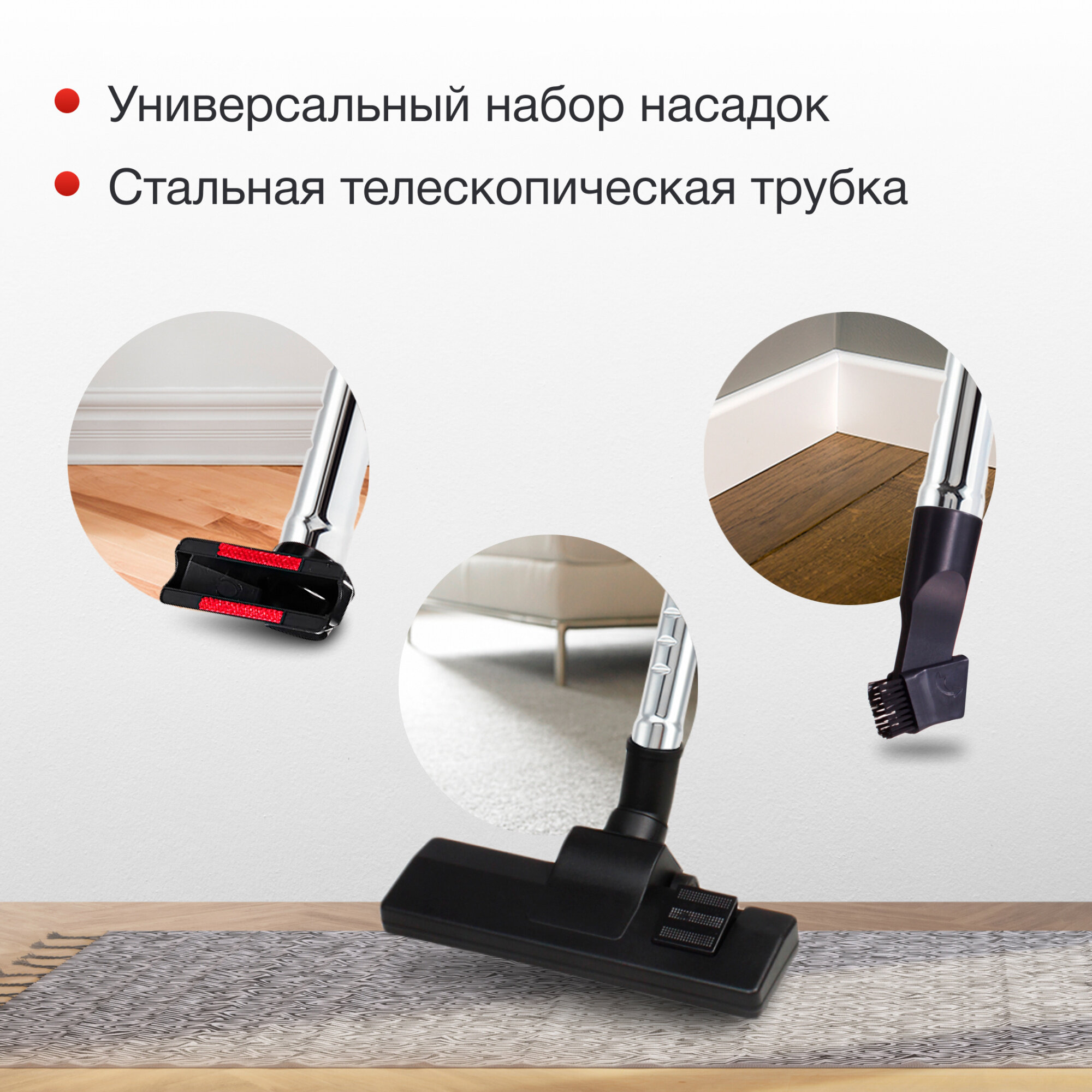 | Отзыв: | Купил этот пылесос для квартиры, и остался в целом довольный. 2500 Вт - это мощь, чувствуешь себя как на танке, всё поднимает. Но конечно же, тут же и минус - громкость. 79 дБ немного напрягает, особенно если убираться поздно вечером. Но насадки хорошие, особенно понравилась для мягкой мебели. ;) |