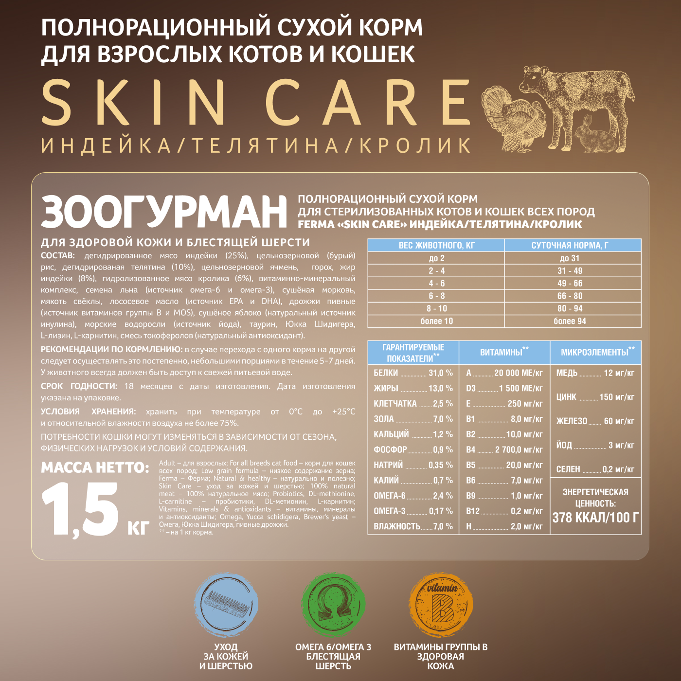 Полнорационный сухой корм для взрослых котов и кошек Зоогурман, FERMA «SKIN CARE» Индейка/Телятина/Кролик 1,5 кг